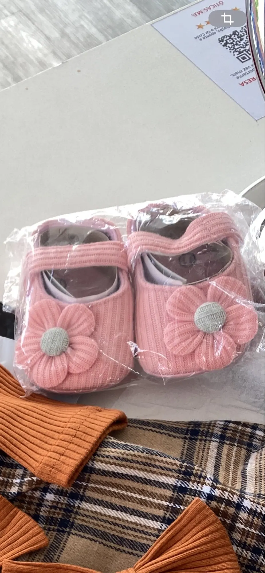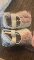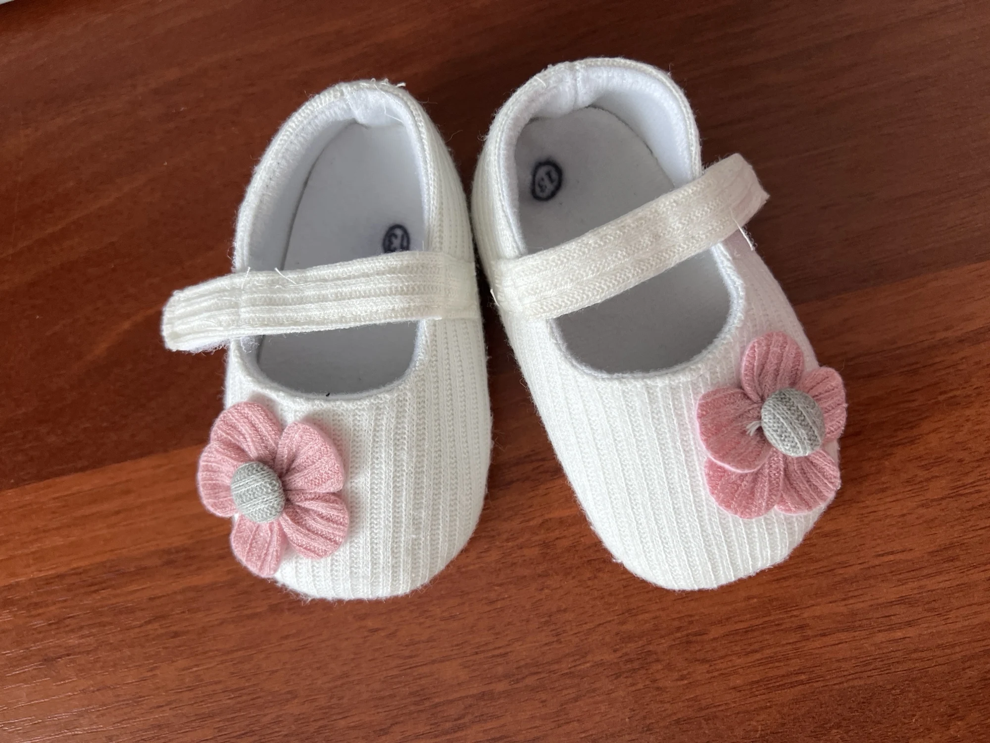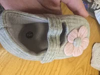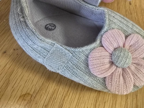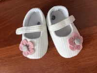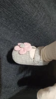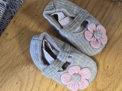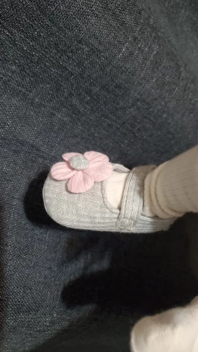 Sweet shoes made of gray fabric with a pink flower closed in Scotch and it looks good, the shoe is flexible. I haven’t measured it for a baby girl yet, so I still don’t know if it suits her and if it’s comfortable for walking. But it looks soft and beautiful. Unfortunately it doesn’t seem anti-slip, but I’ll check it out. Which is sure it’s beautiful, soft and pleasant, I just need to check if it also supports walking and comfortable.