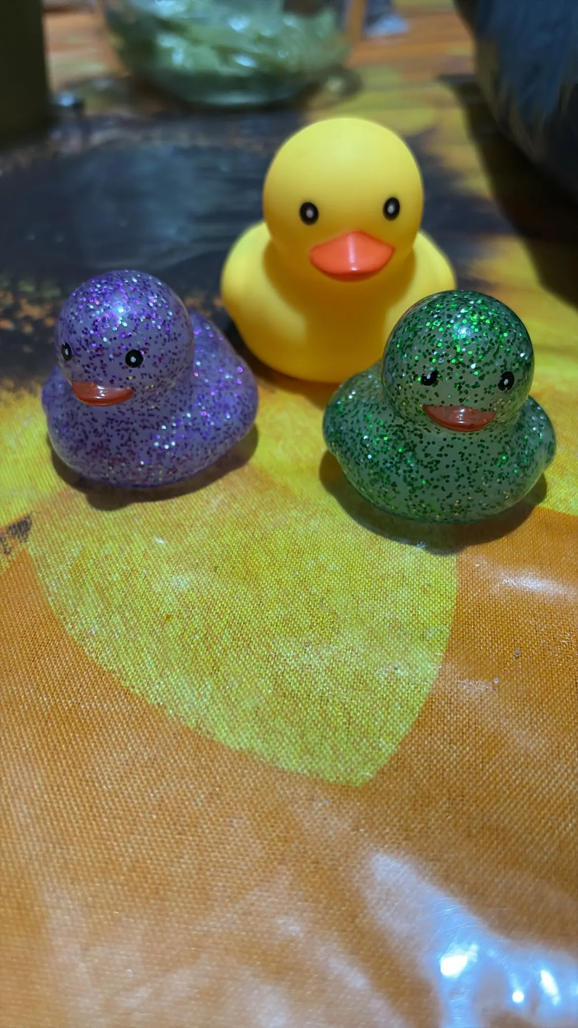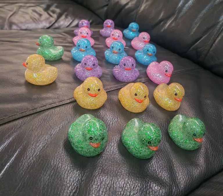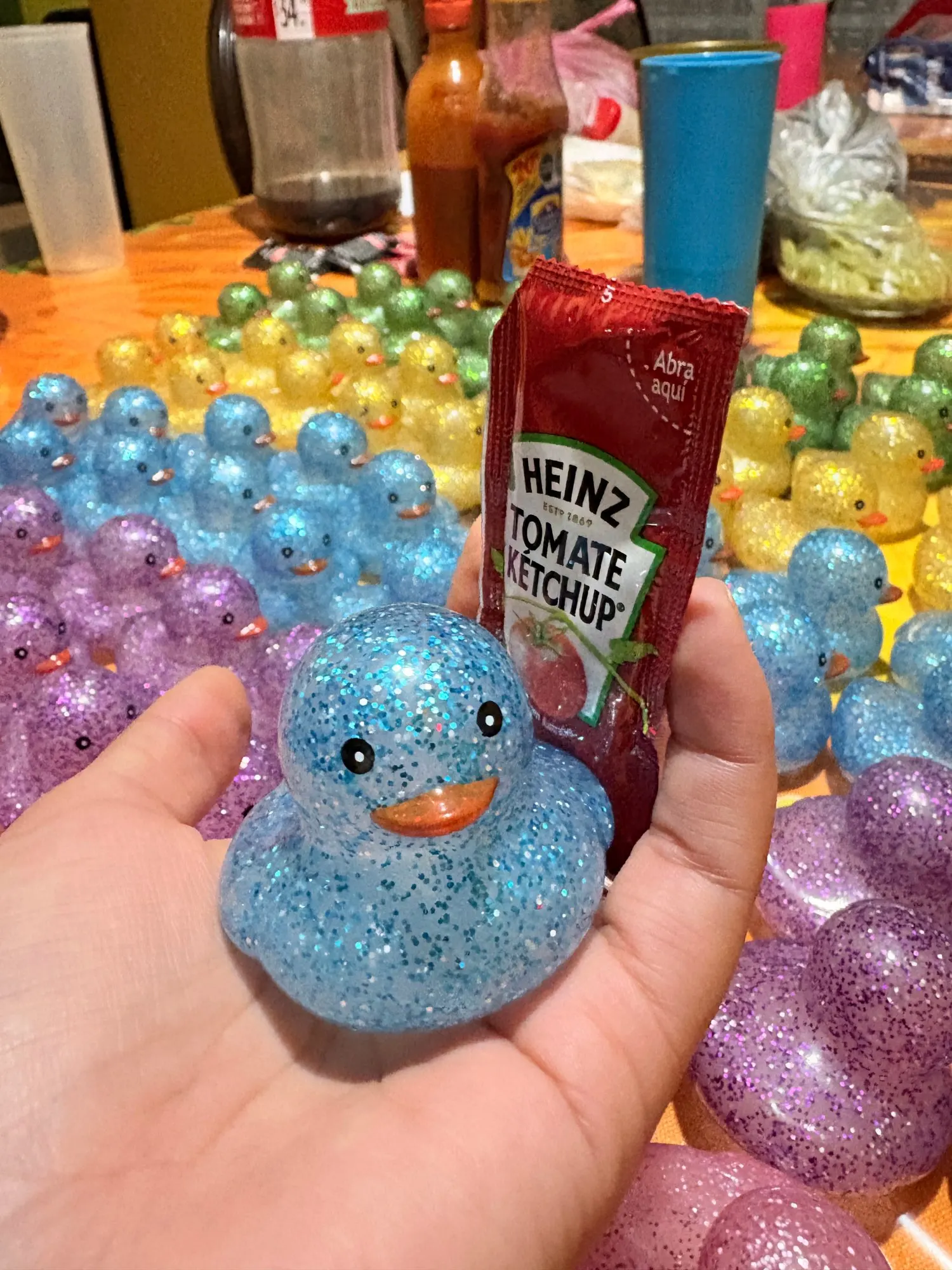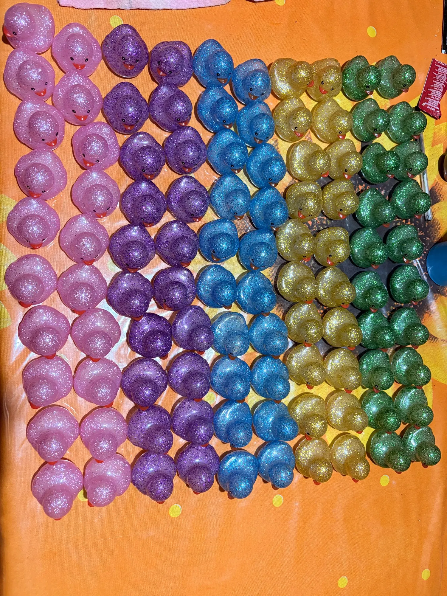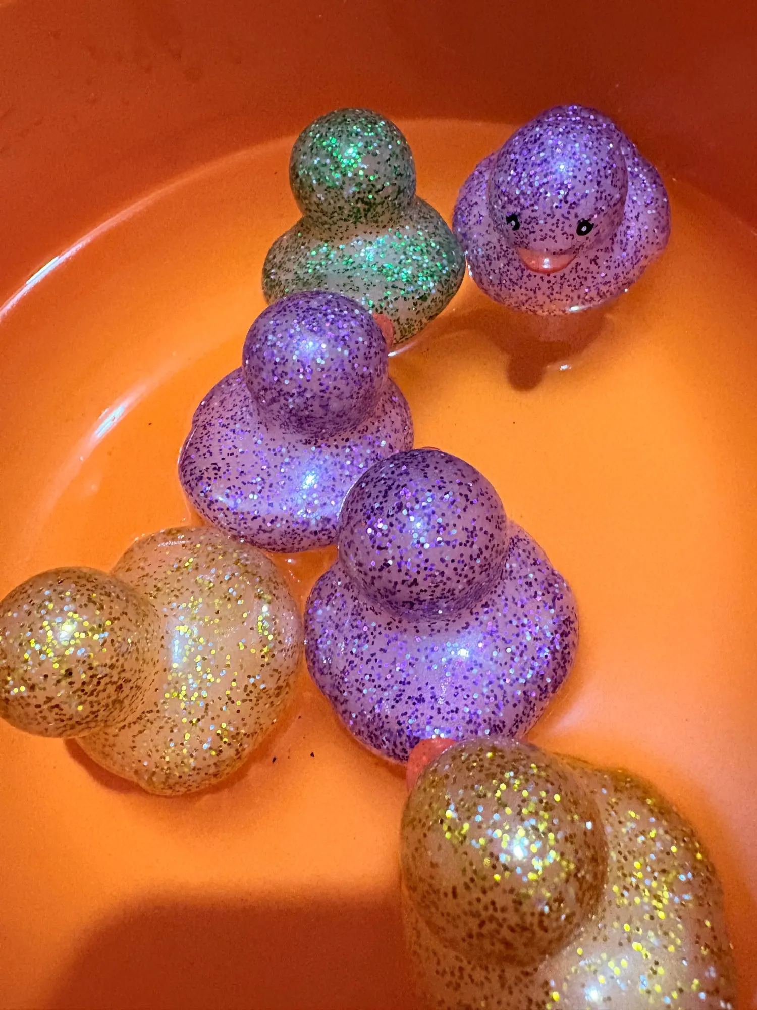 The 100 arrived complete, very quickly, about a week and a half to Mexico. They come in 5 colors: green, blue, pink, yellow, and purple. They are a bit smaller than the traditional duck, but they have a good size. THEY FLOAT! And they float straight up. They make a sound when squeezed and are divine; they’re like diamond inside, seriously they are beautiful!