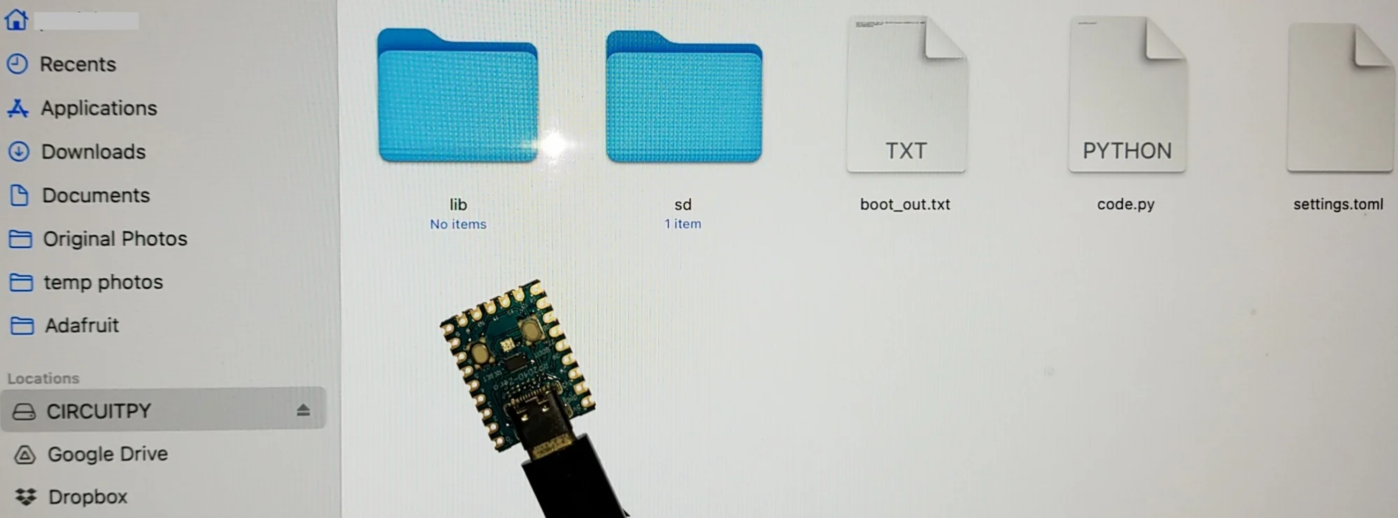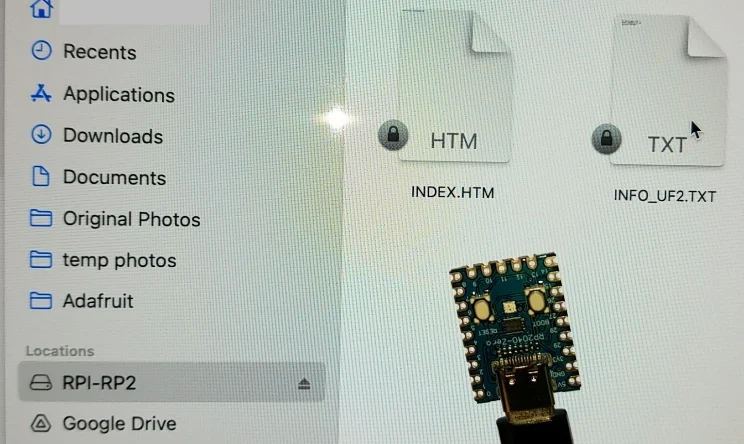 Très agréable. J’ai maintenu le bouton de démarrage enfoncé lors du branchement et le lecteur de démarrage “RP1-RP2” s’est affiché. Intégré dans la dernière version de CircuitPython, et une fois chargé, le lecteur CIRCUITPY s’affiche comme prêt à être programmé.