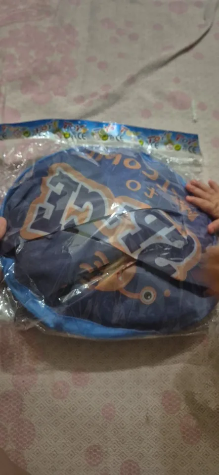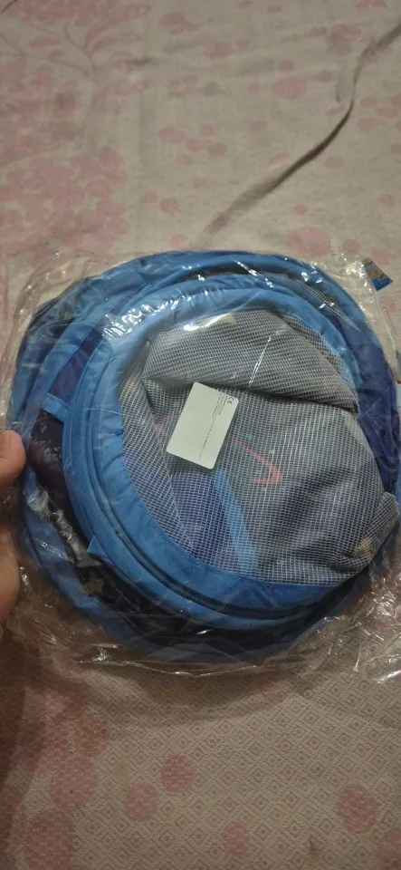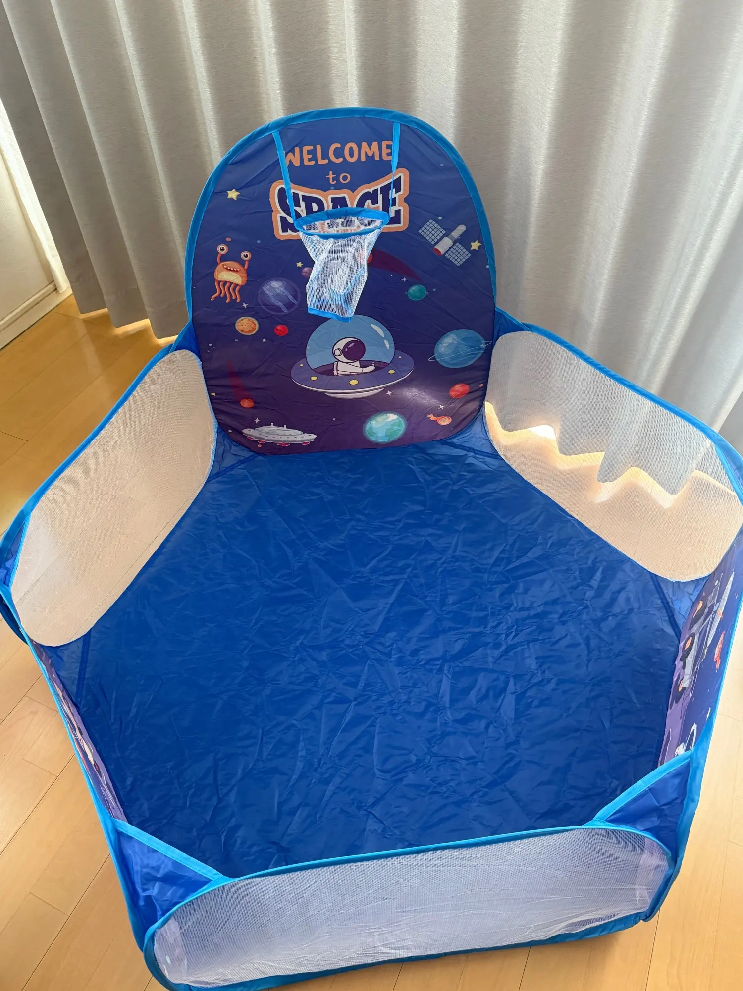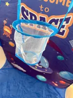 It arrived very quickly! Foldable. It is lightweight and portable. I found it unexpectedly large. The design is cute. The basketball hoop net is fixed. It seems like the child will have fun playing!