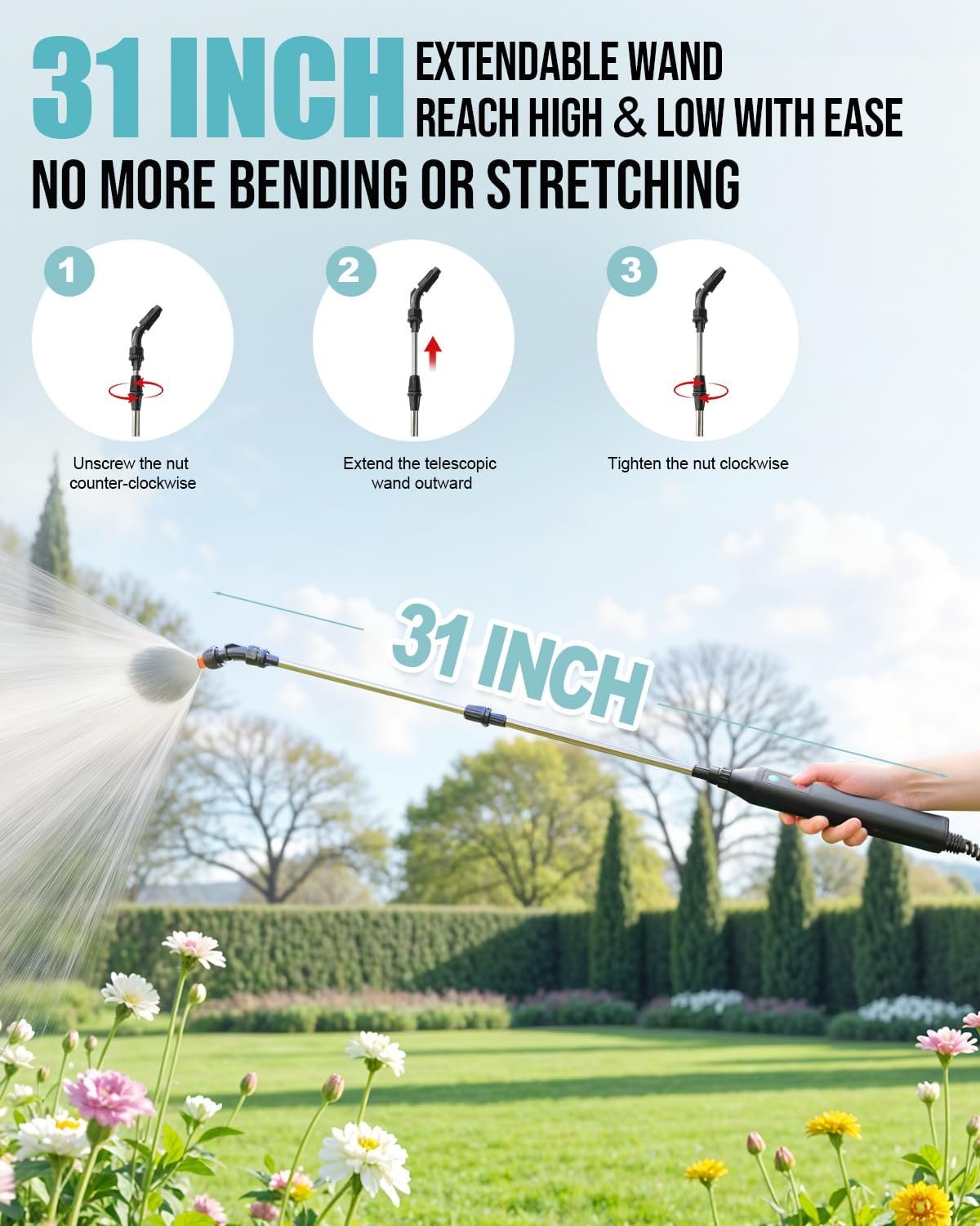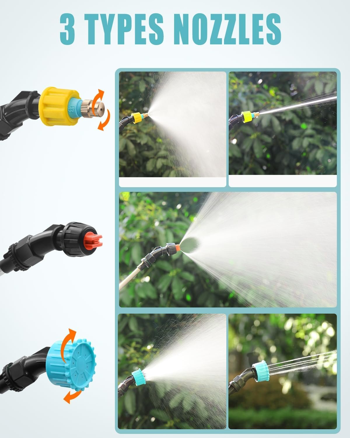 【Versatile Sprayer for Every Need 】This electric sprayer has 3 adjustable modes (low/medium/high) and 3 nozzles (fan/shower/brass) handle any task, from gentle mist to strong jet streams. The garden sprayer includes 2 carrying options – handheld sprayer or attach the adjustable strap for hands-free comfort. Whether you’re using it as a bug sprayer, garden sprayer, or weed sprayer, it ensures easy handling and mobility for all your lawn and garden needs