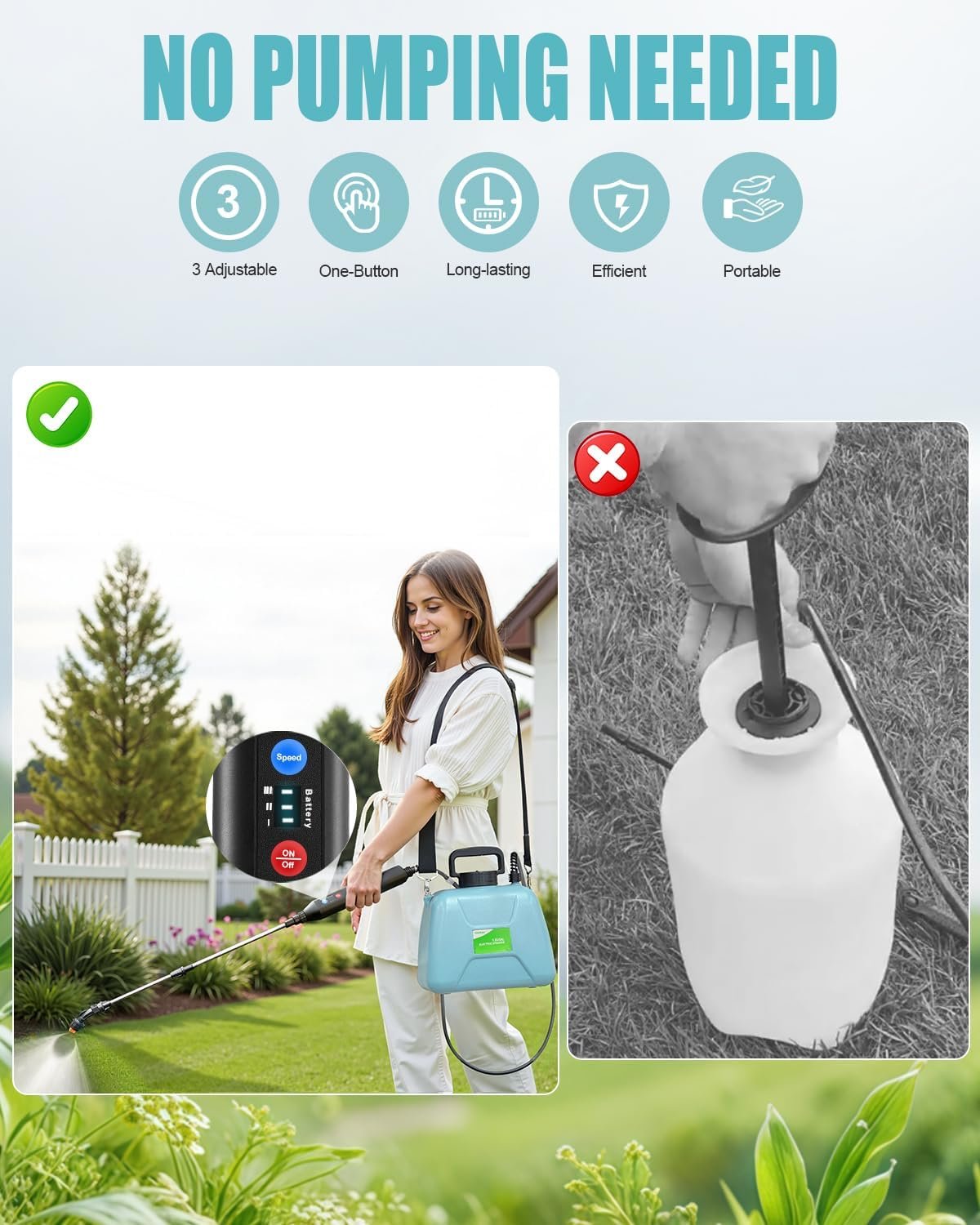 【No More Pumping Again】 The upgraded USB-charging power sprayer has an indicator for tracking battery power, with a 2000mAh built-in battery, it sprays continuously for 2.5-3 hours per charge. battery powered sprayer just press a button to spray automatically. No need pump sprayer any more!