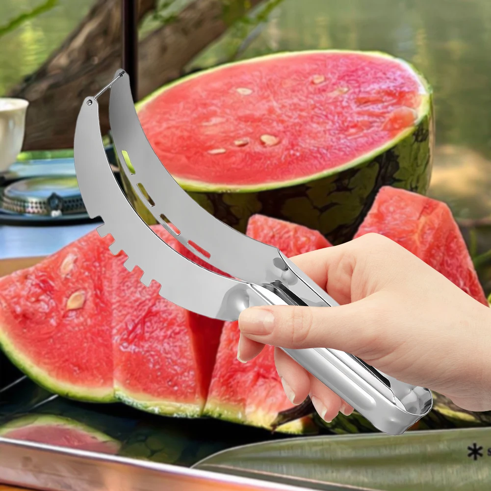 1. Versatile and Multi-functional: The watermelon slicer cutter knife allows you to slice, de-seed, and serve fruits effortlessly. Perfect for slicing watermelons, cantaloupes, honeydews, and many other fruits and foods.