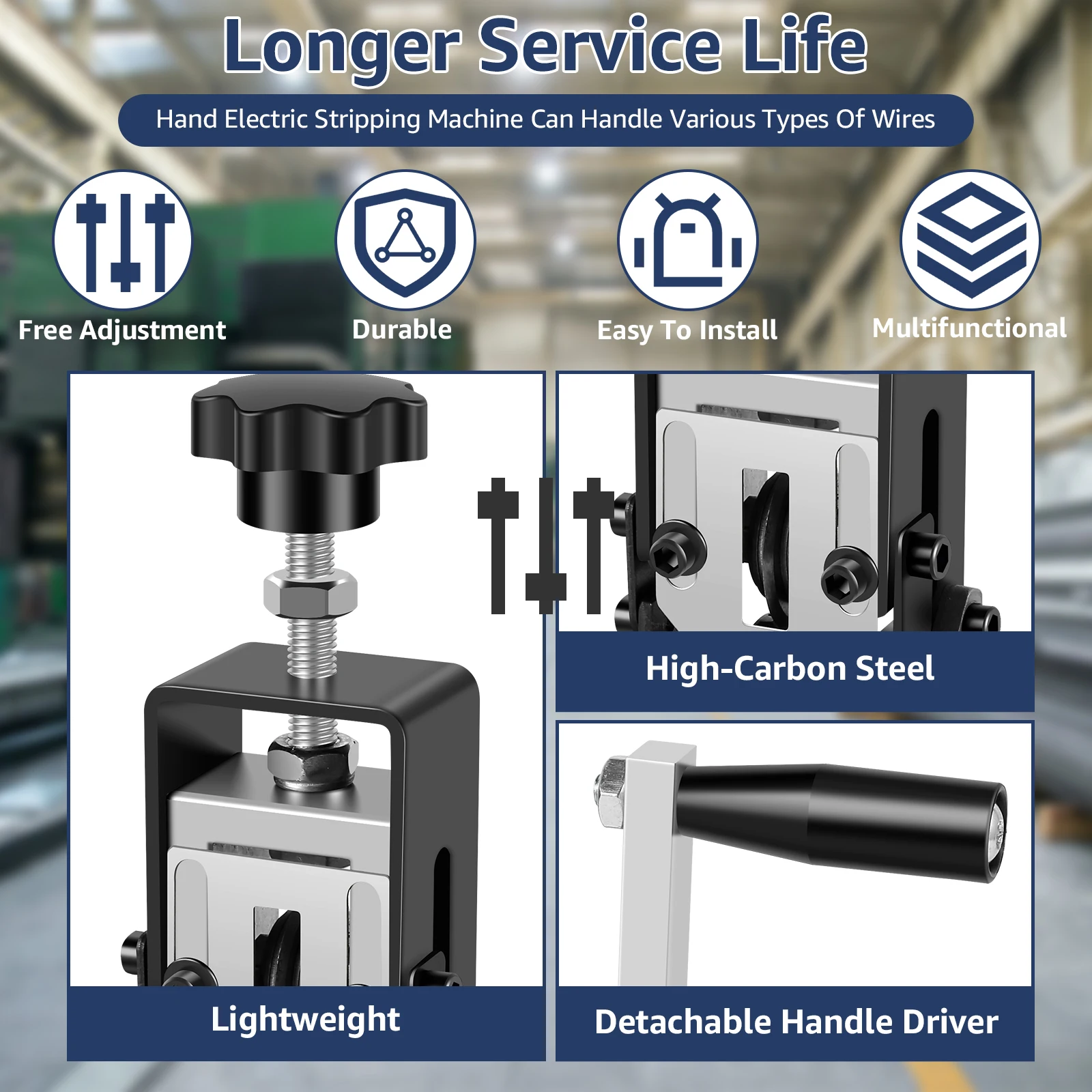 [Manual and Drill Powered Operation] This electric wire stripping machine has a detachable handle driver, smooth and convenient to operate. You can also connect it to an electric drill and strip the wire automatically for faster operation.