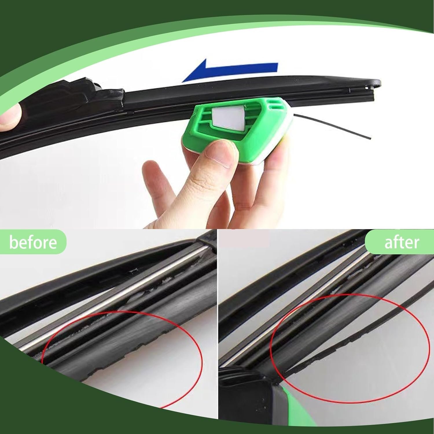 How to Use: First fold the wiper and clean it thoroughly with a wet sponge, select the guide and push it to the wiper lip, pay attention to the direction of the arrow. Using even pressure, pull the wiper restorer over the entire wiper lip. After cutting, just clean it again with a damp sponge.