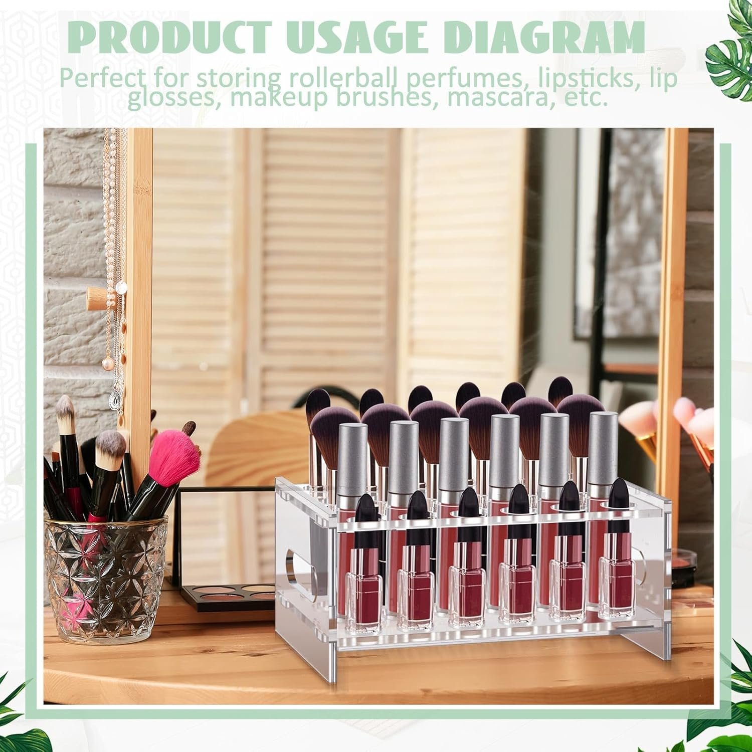 Product Information: the Rollerball Perfume Organizer Size about 8.1 L x 4.8 W x 3.7 H inches, hole diameter 0.59inches, suitable size, can be placed on the dressing table without taking up too much space
