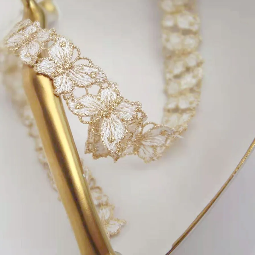 2Yard White Gold Butterfly Lace Fabric Gold Thread Edge Lace Accessories Trim Wedding, Garment Fabric