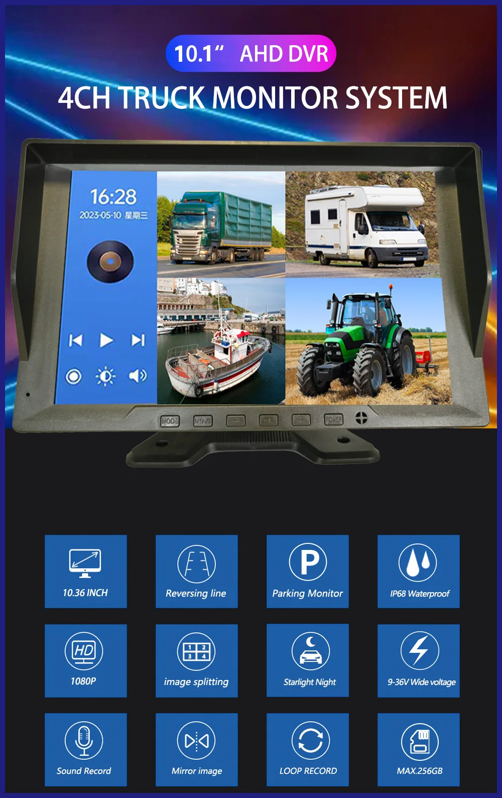 10.1″ 4CH Truck Backup Camera System Vehicle DVR Recorder with Night Vision AHD 1080P Camera for Truck/Bus/Vans