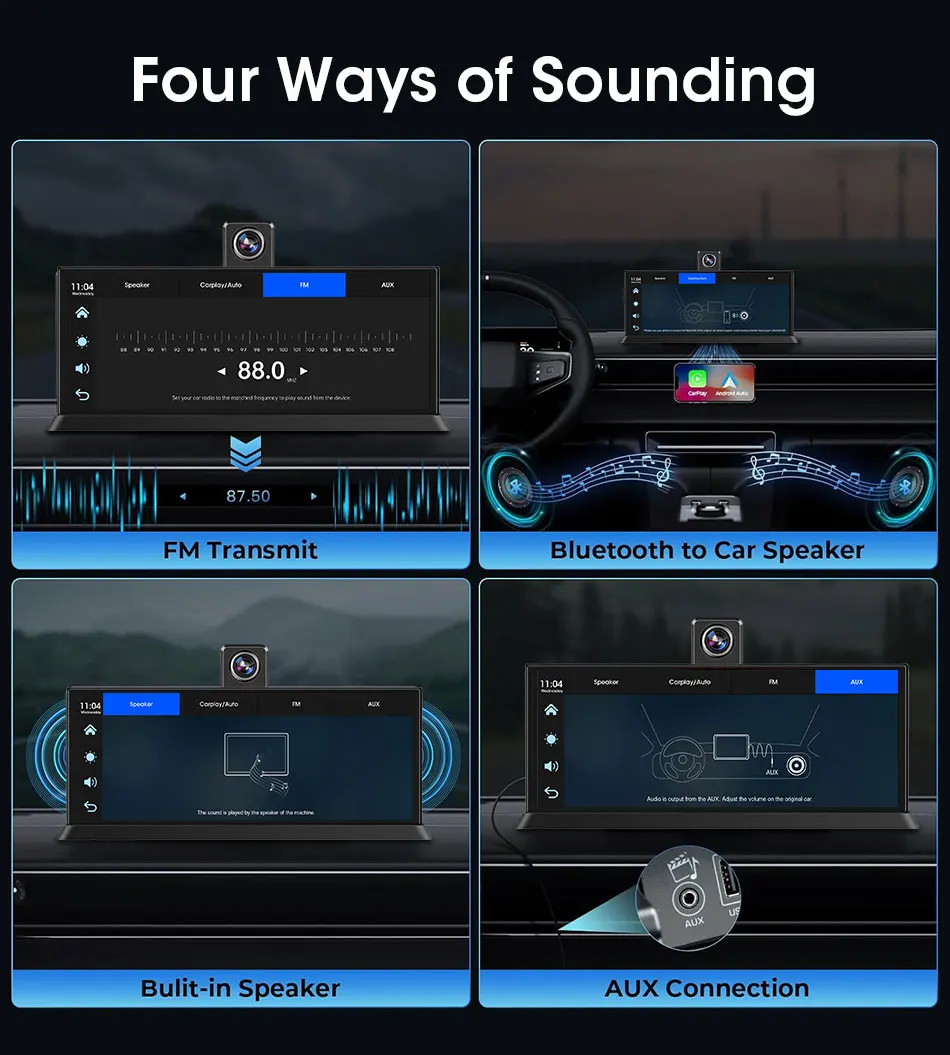 ã€FM Transmission and Bluetooth 】By FM Transmitter, you can set the Same FM Radio Channel on the 11.26 inch car play screen dash mount unit and your original car’s radio. If you want louder sound, you can transfer it to your car’s speaker. You can turn on Bluetooth of the mobile phone and connect the portable android auto radio. Then you can make a Bluetooth phone call and music.