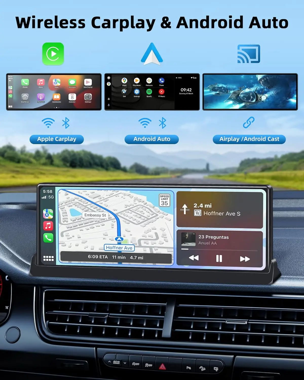 ã€Built in Wireless Carplay & Android Auto】 After you searched for the car play screen stereo via Bluetooth, turn on WiFi & use Carplay / pair it with Android Auto to connect, it is convenient for you to integrate your smart phone, which allows you to make phone calls, play music, access map navigation, and so on. And Siri or other voice assistants will help you voice control, totally hands free for safe driving.