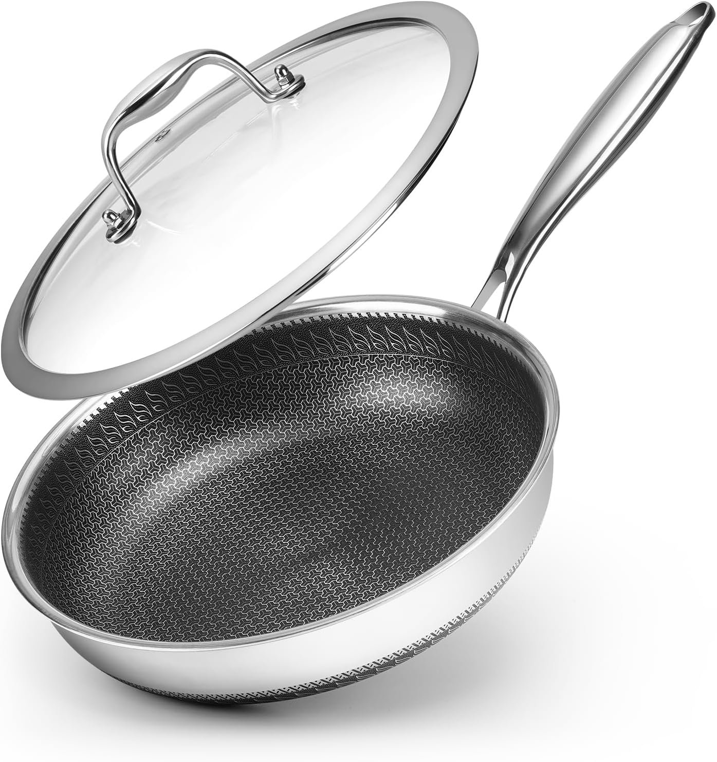 10.5 inch Frying Pan Nonstick with Lid, 2.5 Qt Deep Non Stick Stainless Steel Sauté Pan Skillet, Dishwasher and Oven Safe, Compatible with All Cooktops