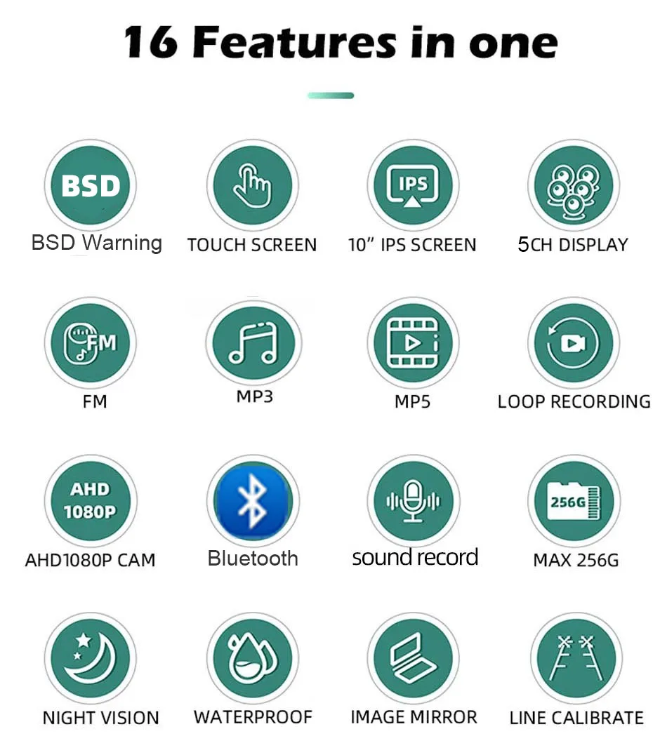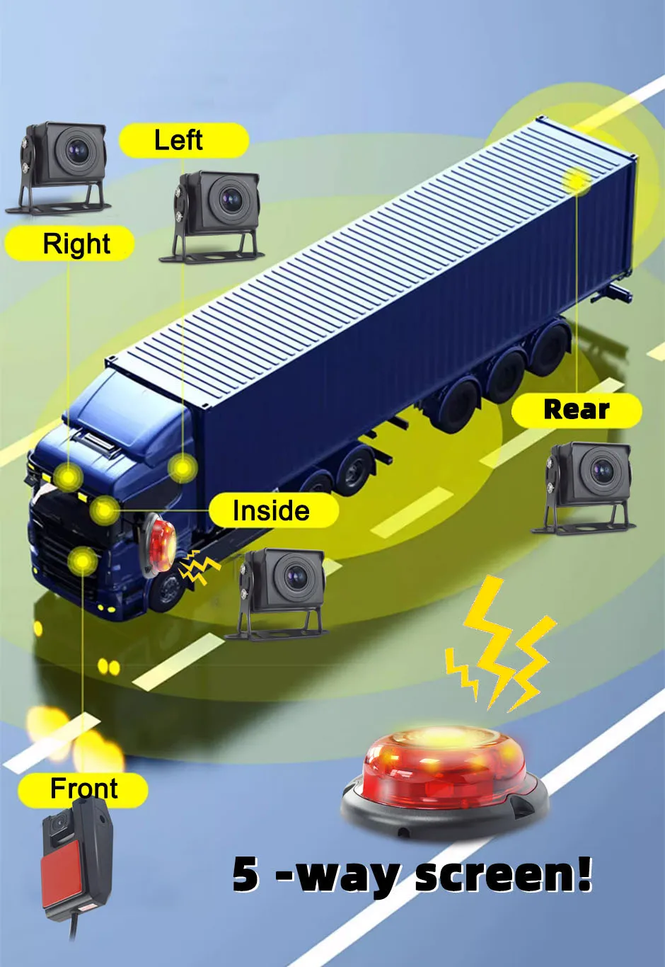 1. 360° vehicle monitoring system: Come with 5CH AHD HD cameras (front/ rear/ left/ right/interior). Each camera can cover 140° viewing angle, 5 cameras system not only can provide rear view when you are parking or reversing, but also provide 360° view when you are driving.