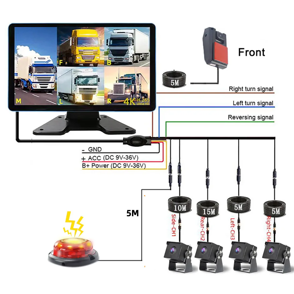 Default 1pcs 15 meters extending cable for rear view, 4pcs 5 meters extending cable for front, left and right view. Support to customize the cable as you need.