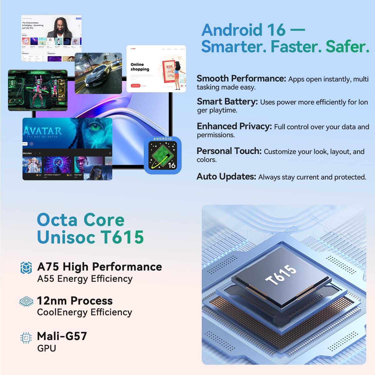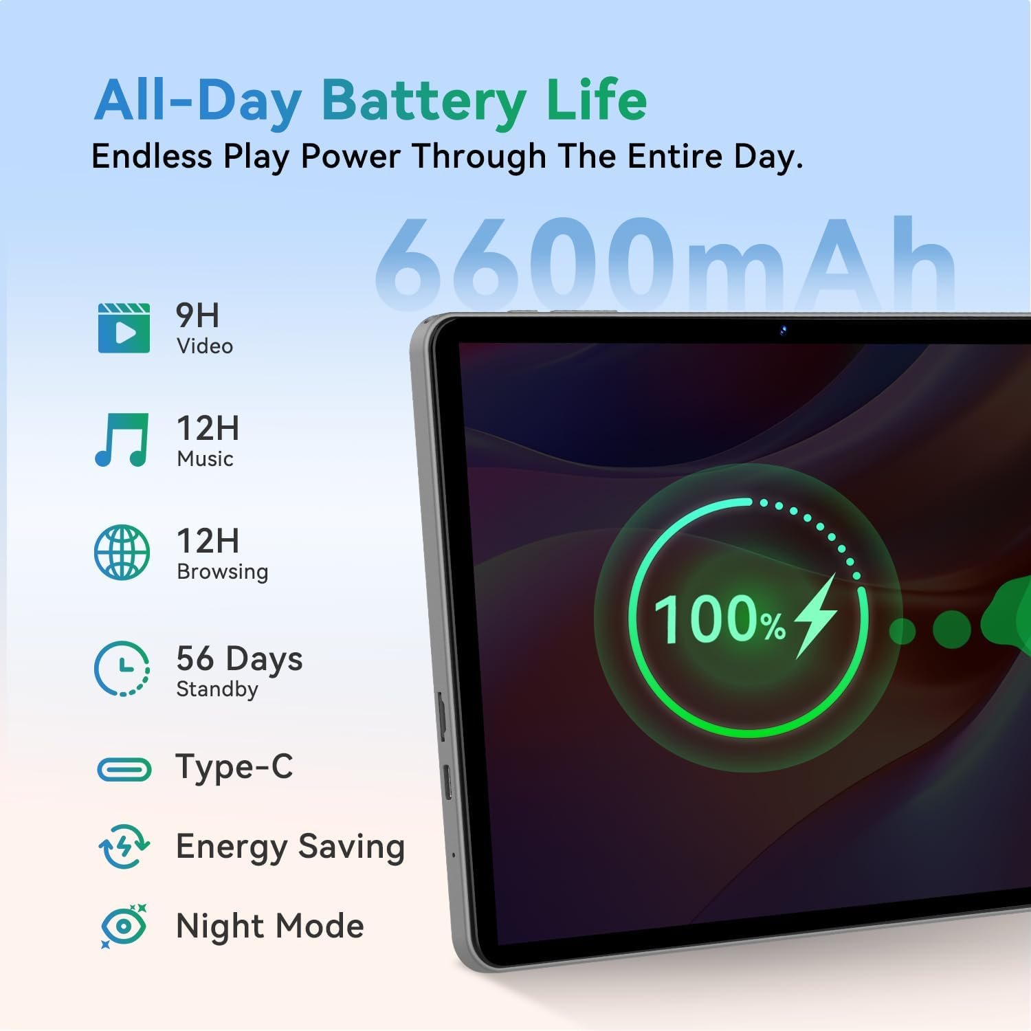 High-Performance Octa-Core Processor+ Dual-Band Wi-Fi Model+ Bluetooth 5.0+ 6600mah High-Capacity Battery – Equipped with the unisoc T7250 octa core CPU, delivers smooth multitasking. wireless connectivity, supports 2.4/5 GHz wifi bands for stable connections; bluetooth 5.0 enables seamless pairing with external devices like speakers, headphones, and accessories. 6600mah battery ensures extended usage for entertainment, work learning