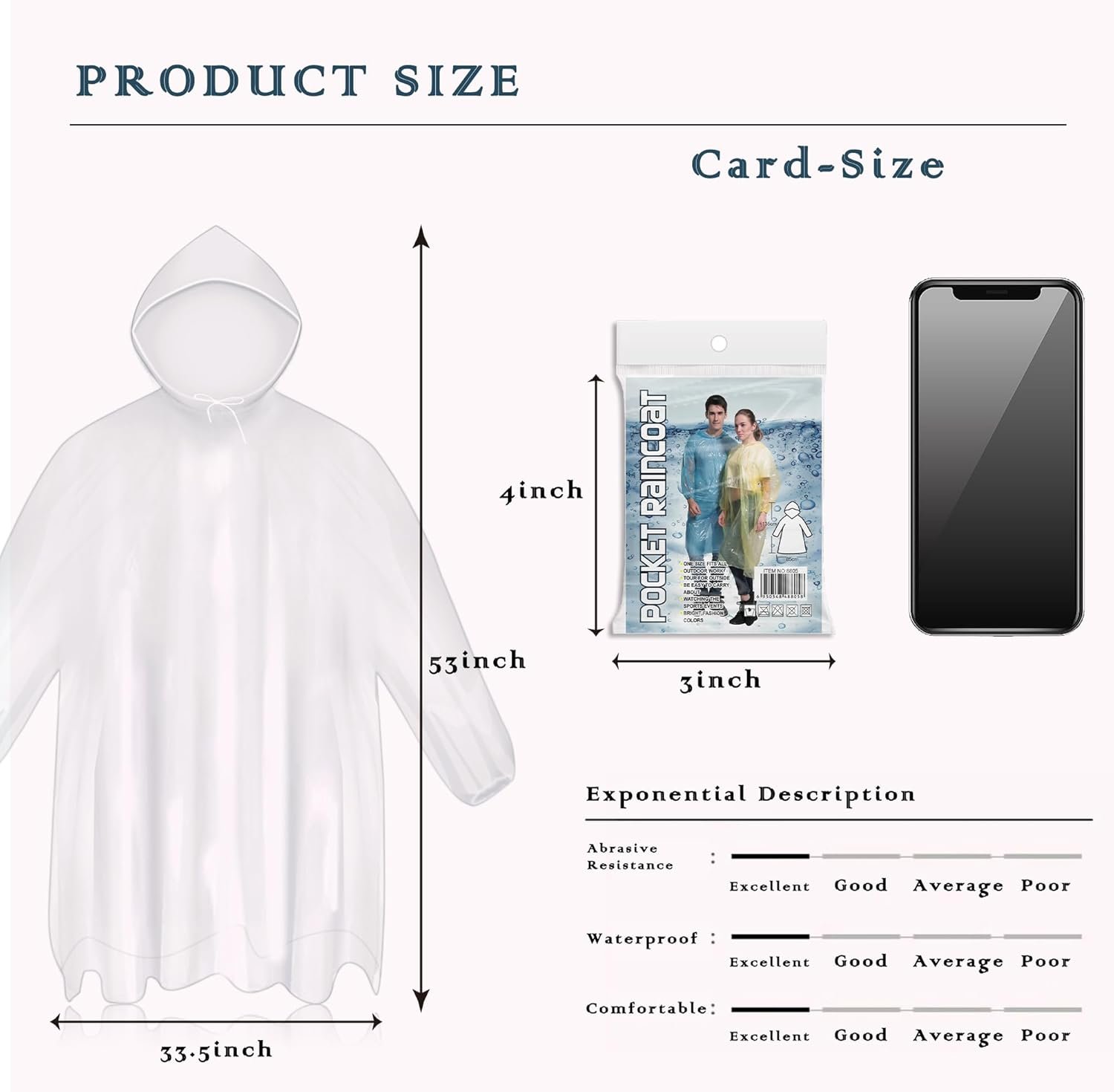 Universal, Comfortable Fit: Designed to comfortably fit most adults, our clear rain ponchos measure 53 inches in length and 33.5 inches in waist circumference. Their generous one-size-fits-all fit ensures that the entire family can enjoy unrestricted movement and reliable protection in any weather.