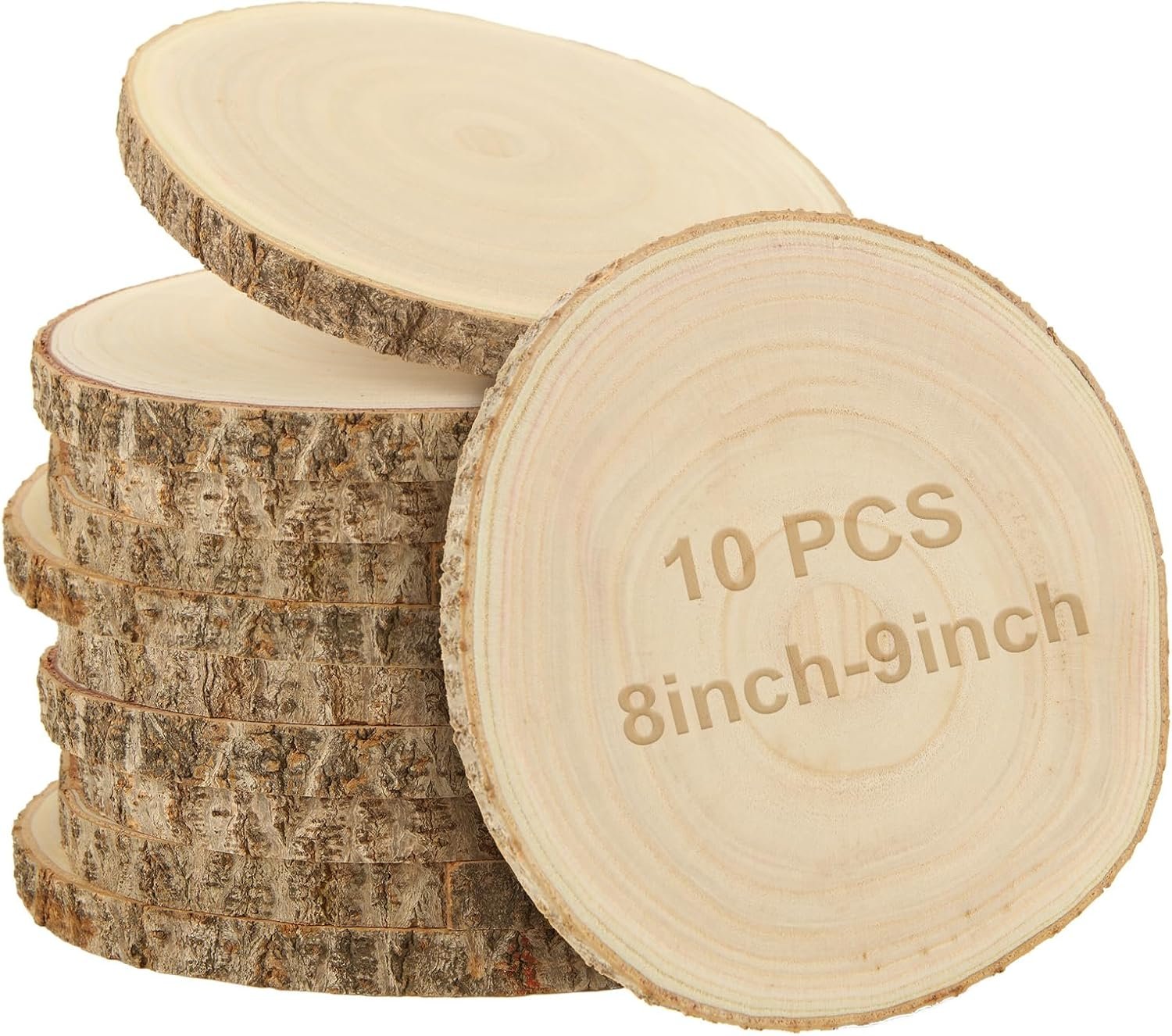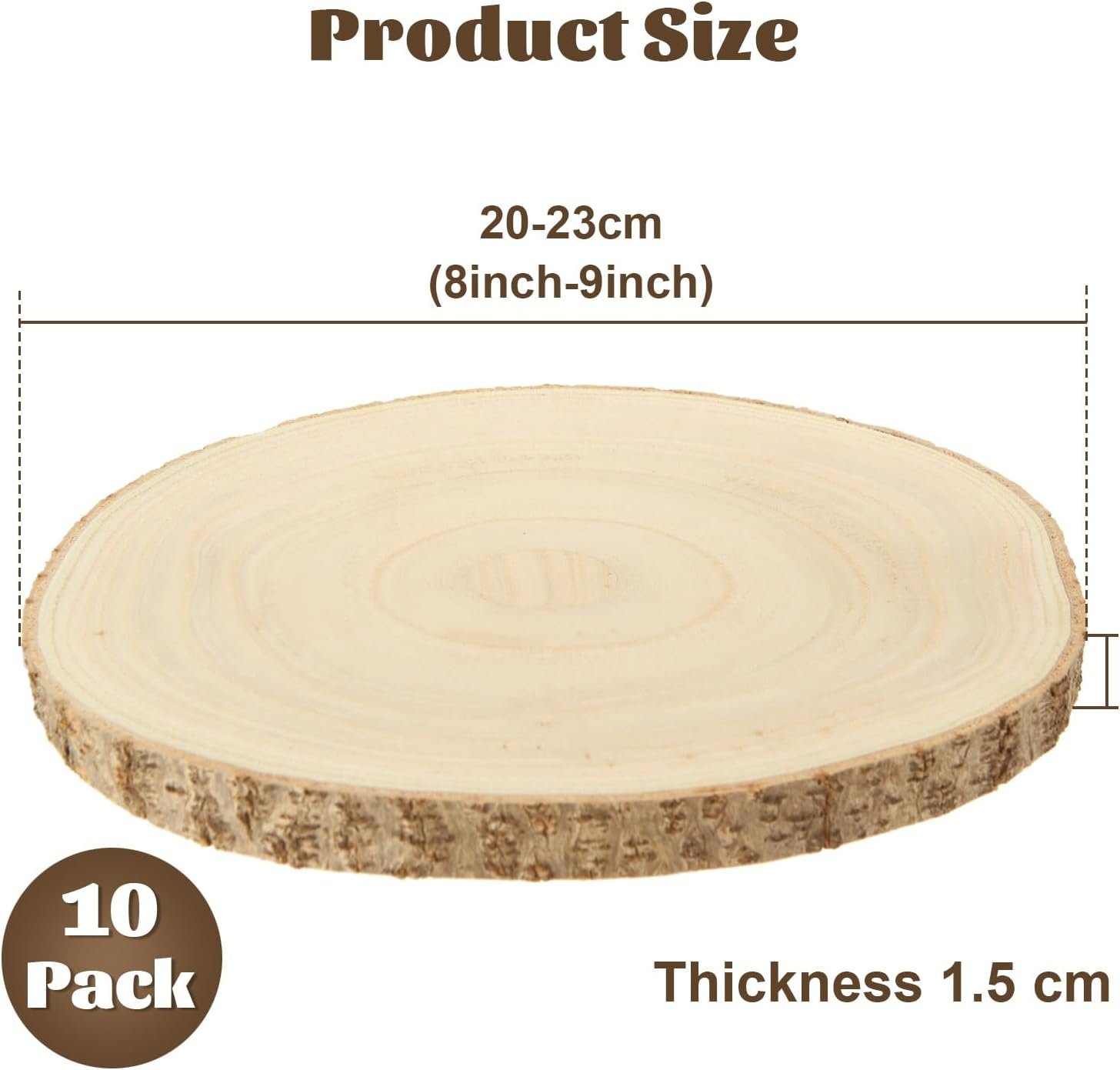10 PCS & SIZE: You will receive 10 pcs unfinished round wood slices. Lenght: approx 7.8-9 inch(20-23 cm); Thickness: approx 0.6 inch(1.5 cm). Enough quantity to meet your DIY crafts projects needs