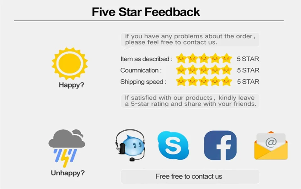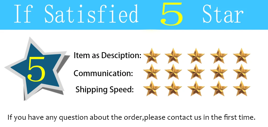 4.Once you received your products, please give a5-starFeedback, you will be highly appreciated and you will get god’s blessing. Your satisfaction is our greatest motivation.
