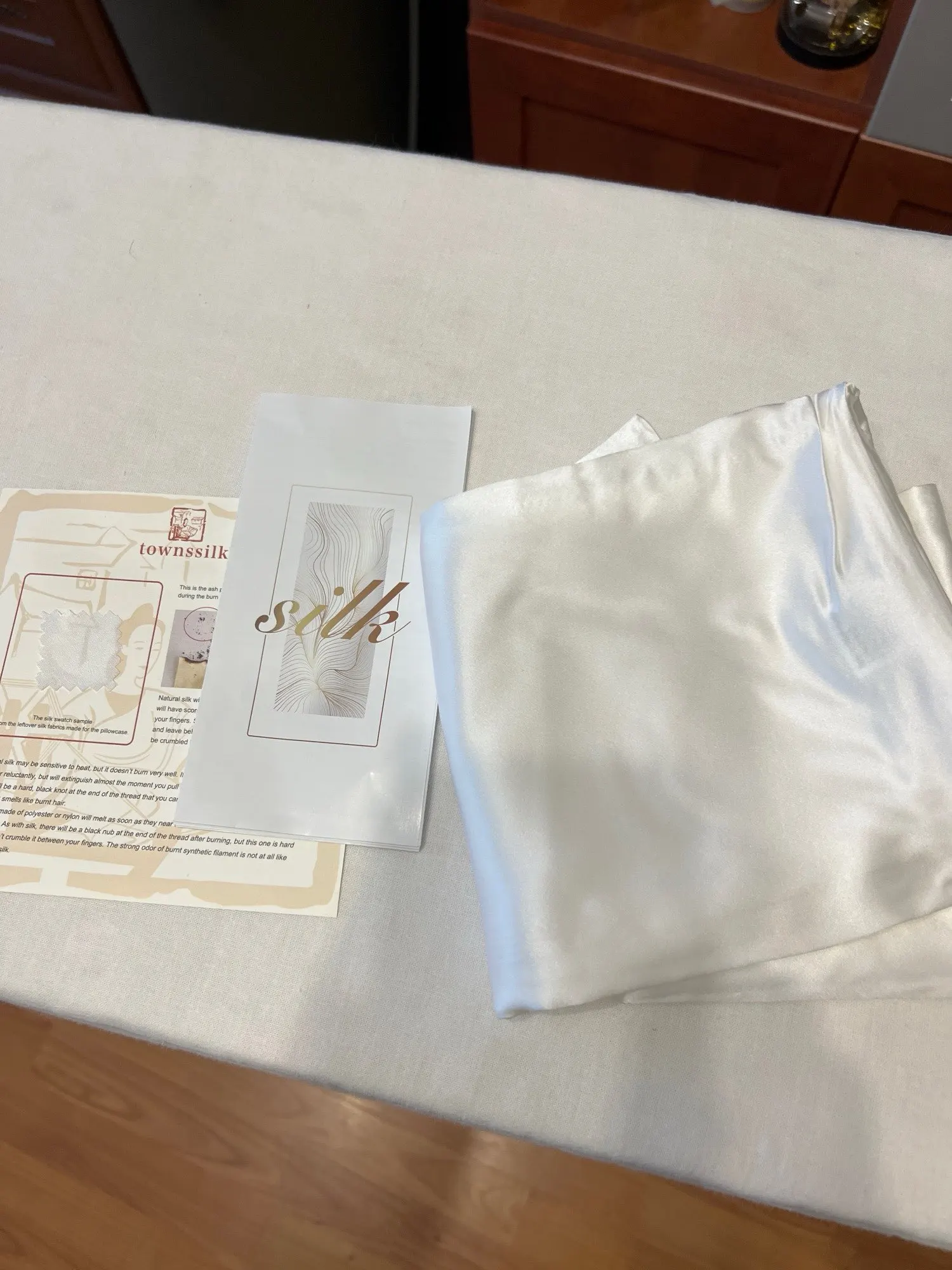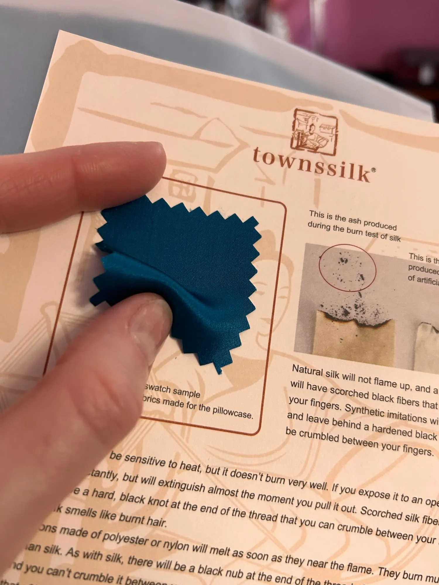 Purchased two of them, performed the burn test and it did sort of curl but when i pinched the burned material it did fall off like ash. And you can definitely smell something burning, no plastic smell. It holds a crease, unlike satin. It runs smoothly across itself and doesn’t catch. The inside had me a bit concerned. But doesn’t have a separate backside like satin does. Appears to be silk.
