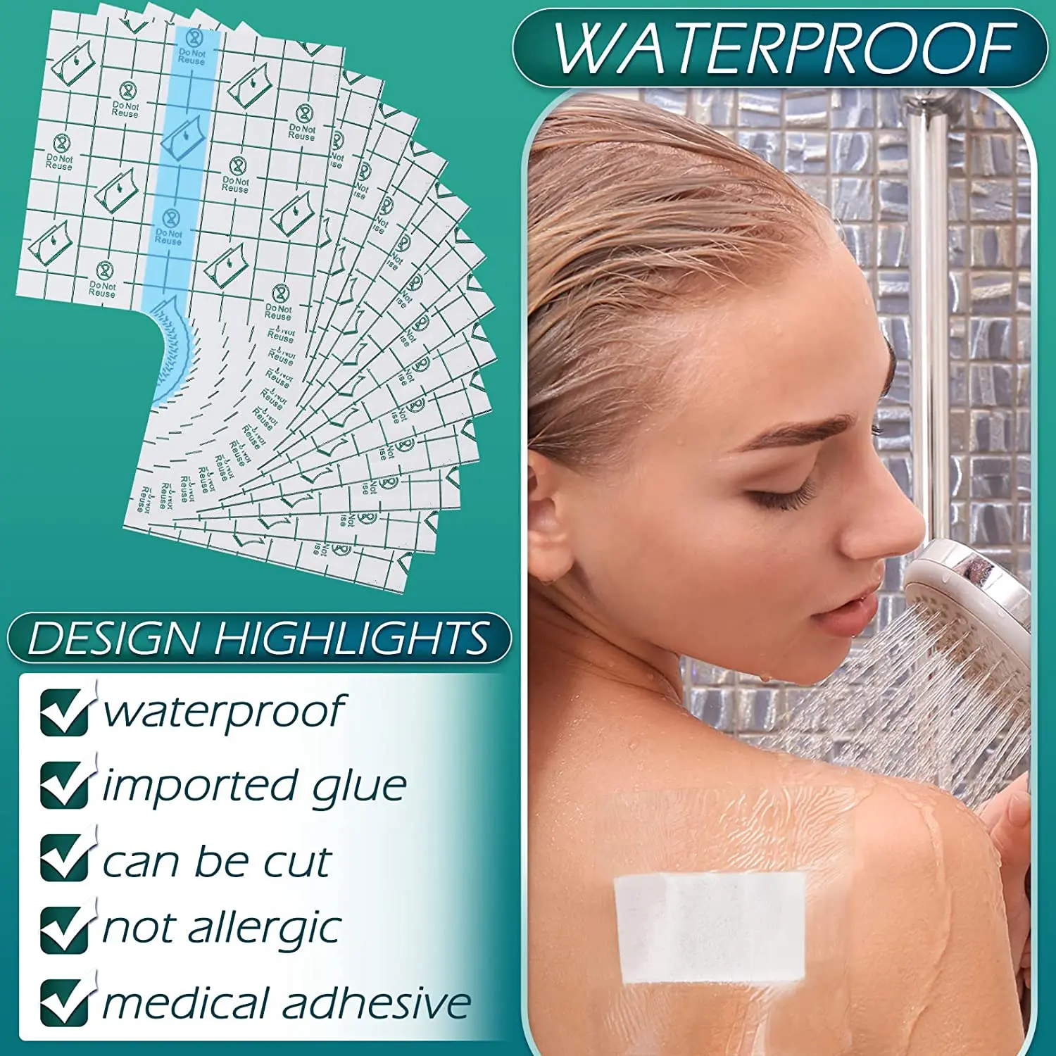 Medicinal special pu membrane, waterproof and anti-allergic, can take a bath. Because stickiness and waterproof are very good, the breathability is not very good. It can’t exceed 10-12 hours per day, otherwise it may have a reaction.