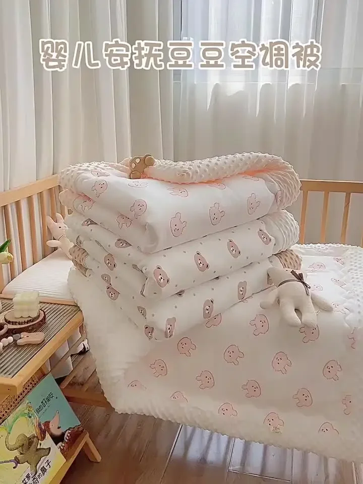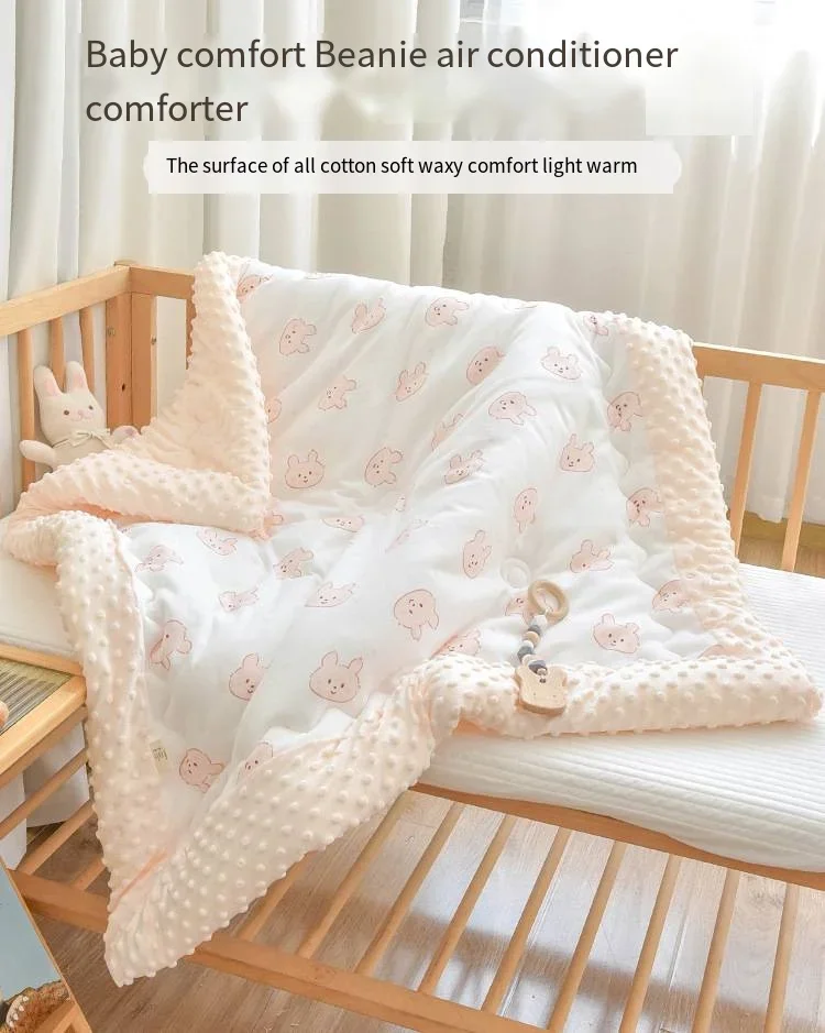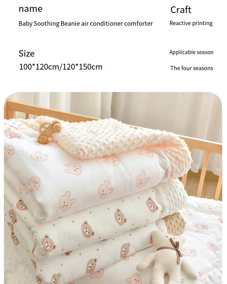 Baby Soothing Doudou Air Conditioner Quilt fixation is durable and does not grind edges, with cotton clips for fixation Double sided design with one side made of bean velvet and one side made of all cotton knitted fabric Exquisite wide edging design that is not easy to thread and is not afraid of machine washing Skin friendly fabric, moisture absorption and breathability, active printing and dyeing A-class quality Washing suggestions: It’s best to wash by hand, choose gentle mode for machine washing or put a laundry bag in it Wash with water below 30 degrees Celsius, do not rinse, do not expose to direct sunlight, and do not boil with high temperature water (Non removable and washable, overall water wash) Material: 100% cotton surface layer, 3D bean down bottom layer Filled with cloud soft feather silk cotton (polyester fiber) Size: 100 * 120cm, suitable for ages 0-3 Kind reminder: 1. The quilt has a large volume and has been vacuum treated for convenient transportation After receiving it, it may feel thin, so it is necessary to air dry it in good ventilation and sunlight for a few hours first Can restore fluffiness.
