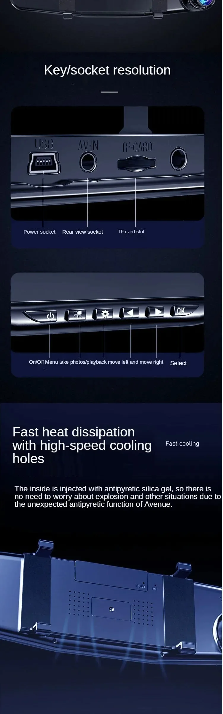 Size: 300*80*15mm Display screen: 4.3 inches Languages: English, Simplified Chinese, Traditional Chinese, French, Japanese, Spanish, Portuguese, Russian, etc. Shooting angle: 170° pixels: 12 million pixels: 1080P power supply: 12V Voltage: 5VRated Current: 1A/2A Transmission rate: 3M/SLoop Recording: When the capacity of the TF card is full, it will automatically overwrite the previous recording with a new file and keep the recording, except for locked files. Equipped with 170° camera to monitor the road, reduce blind spots, capture almost everything in front of the car, and effectively provide all-round protection for your car. The large LCD screen provides clearer videos and images. Full HD large screen displays the road conditions in real time, giving you a perfect visual experience. Ultra-thin design, easy to install, use and carry. Main accessories: 1x host, 1x car charging power cord, 1x strap, 1x rear camera (optional). This type of driving recorder is simple to install. It can be directly fixed on the windshield. People who don’t know how to install it can also do it. Imported quad-core processor, running smoothly, general list recording 300W pixels, high-definition front camera 1200W pixels. Rear camera with 300W pixels [Single shooting]: “Only shoot the front surface, loop video”, [Double shooting]: “You can shoot front and rear, there are reversing images, the red line of the rear camera is connected to the positive electrode of the reversing light