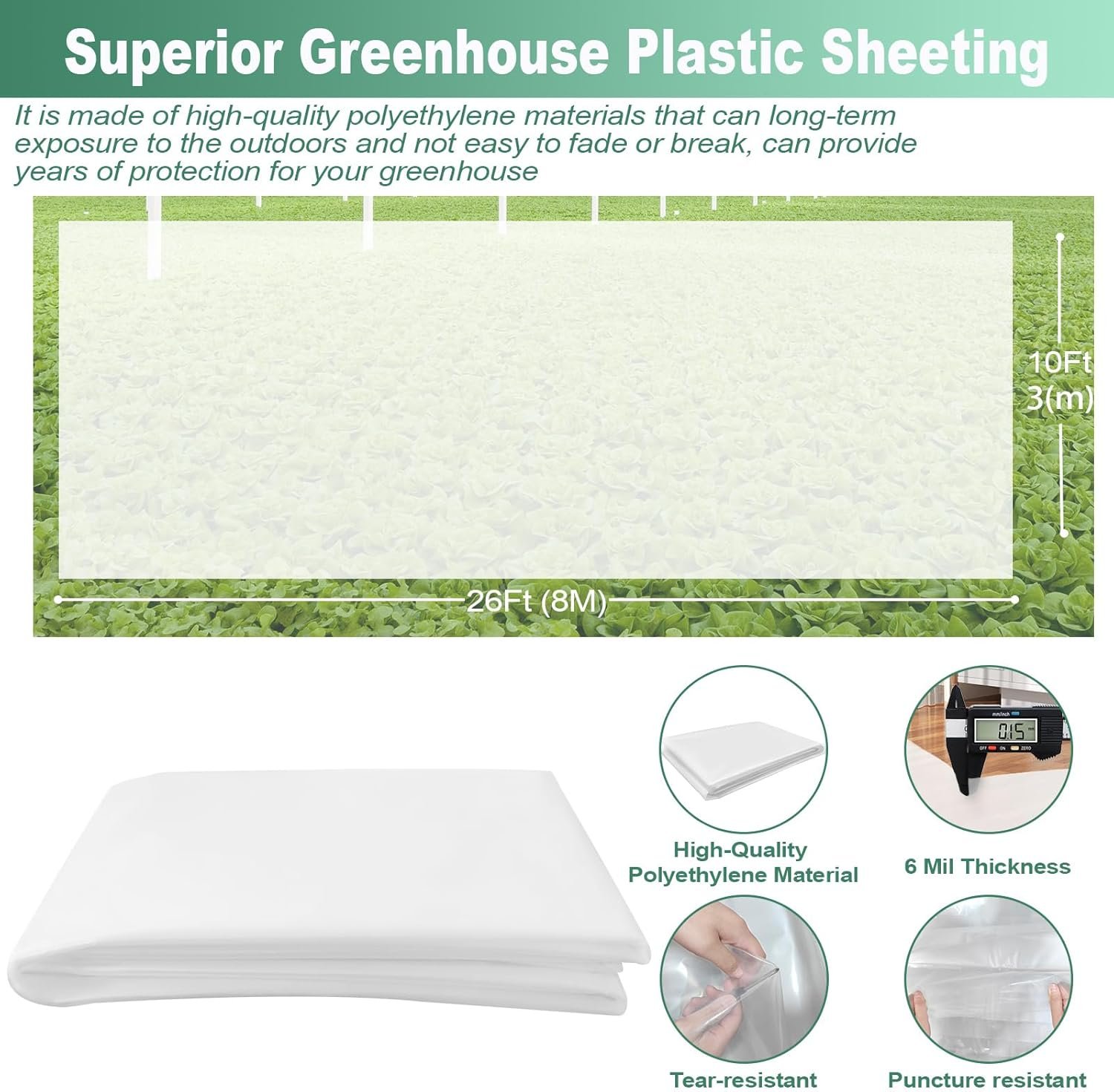 10ft*26ft Greenhouse Plastic Sheeting,6mil Thickness Greenhouse sheeting,4 Year UV Resistant Hoop Green House Plastic Cover for Farm,Agriculture,Garden
