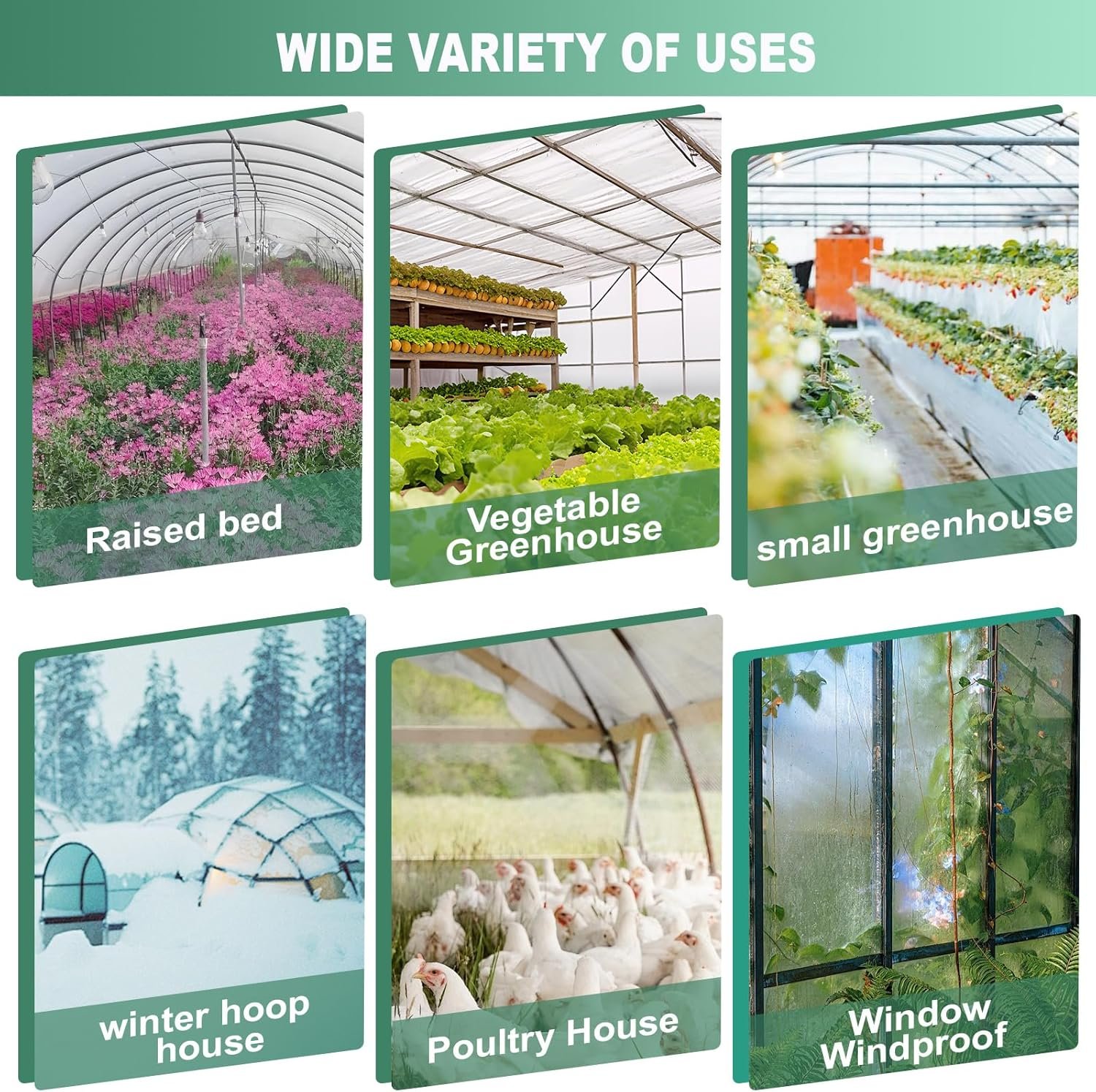 WIDE VARIETY OF USES:This 6mil greenhouse plastic is great for raised beds, vegetable greenhouses, small greenhouses, winter hoop houses, poultry houses, and window windproofing. It’s lightweight, easy to install and remove, and can be replaced whenever necessary.
