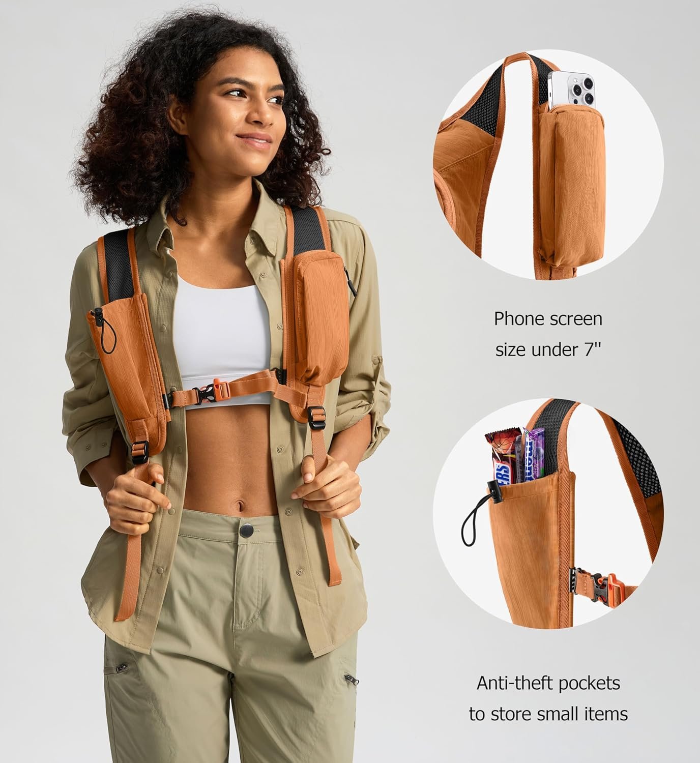 CELL PHONE POUCH: The zippered pocket on the left shoulder strap will hold a cell phone screen up to 7 inches, and on the other side is an anti-theft pocket with an elastic cord closure, so you can put some items such as a wallet and snacks.