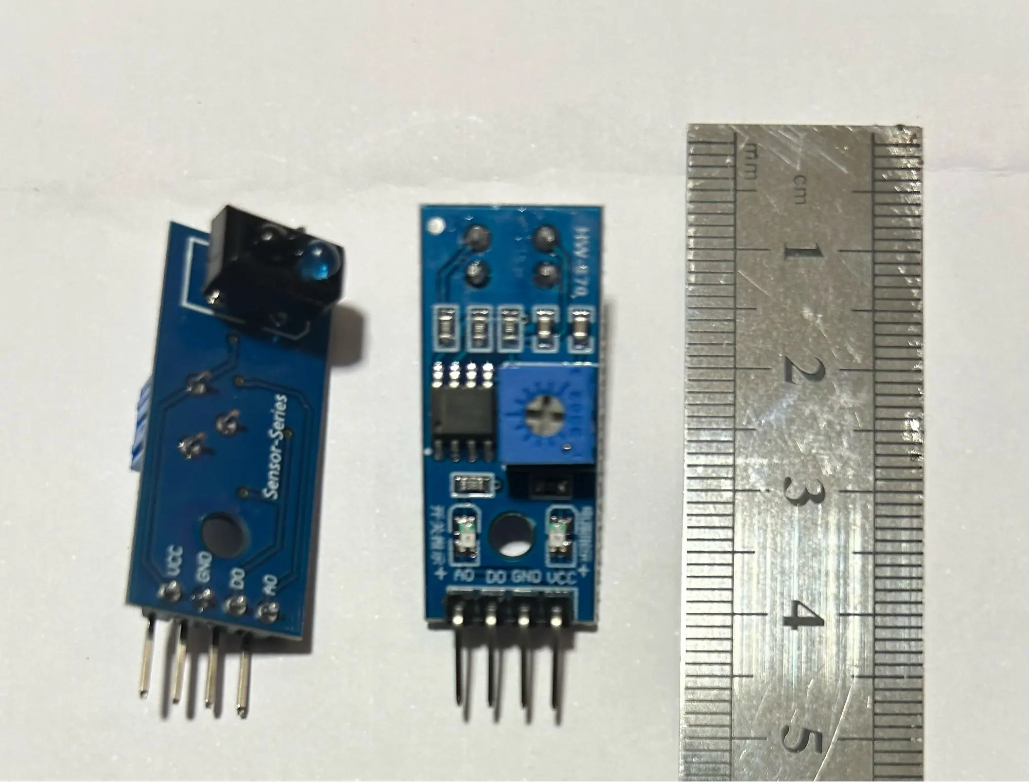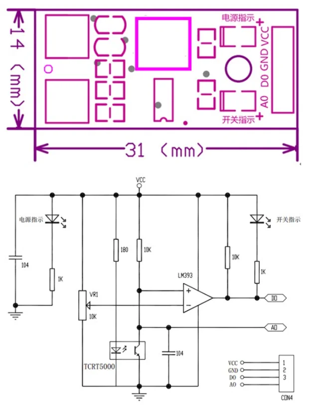 When VCC (3.3V-5V) and GND are connected, the module power indicator will be on, and the infrared emitting diode of TCRT5000 sensor will continuously emit infrared rays. When the emitted infrared rays are not reflected back or are reflected back but not strong enough, the infrared receiving tube will always be turned off. At this time, the module output terminal is high, and the indicating diode will always be off; When the detected object appears in the detection range, the infrared ray is reflected back with enough intensity, and the infrared receiver tube is saturated. At this time, the output terminal of the module is low level, and the indicator diode is lit. The DO output interface can be directly connected with the IO port of the single chip microcomputer, generally connected with an external interrupt. Analog output AO When the infrared signal of the transmitting tube is reflected and received by the receiving tube, the resistance of the receiving tube will change, which is generally reflected in the form of voltage changes on the circuit, and the processed output results can be obtained after ADC conversion or LM324 and other circuit shaping. The change of resistance originates from the intensity of infrared signal received by the receiver tube, the color (reflectivity) and shape of the reflecting surface and the distance between the receiver tube and the reflecting surface.