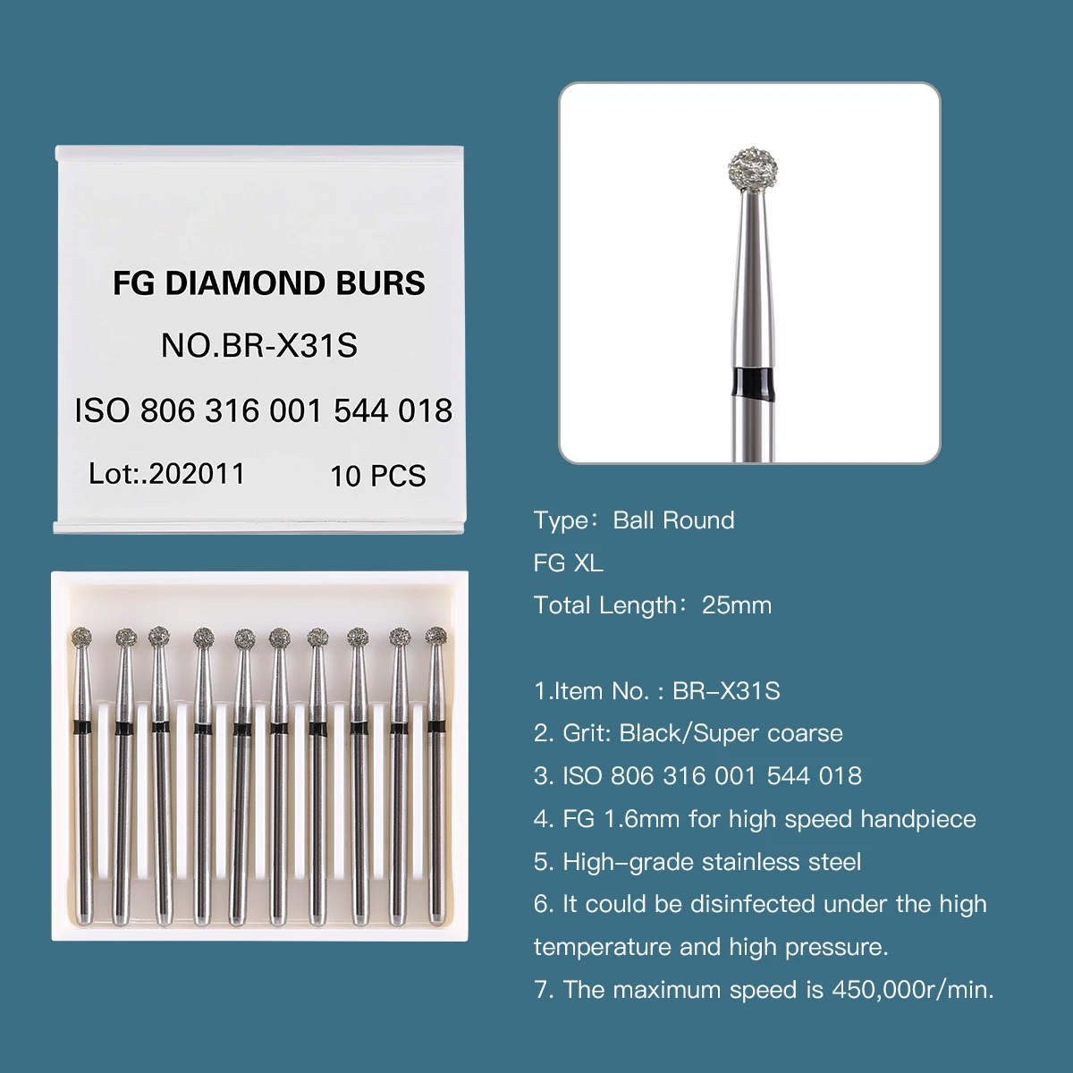 10pcs/Pack AZDENT Dental Diamond Burs Drill Ball Round Type 25mm FG 1.6mm For High Speed Handpiece 450000r/Min