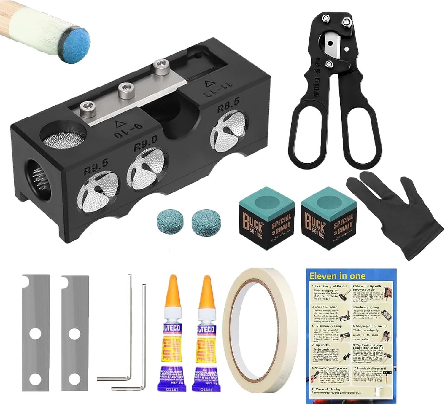 【PREMIUM QUALITY 】Built with lighter yet stronger materials, this tool provides a premium feel without adding unnecessary bulk. It’s a reliable tool for any billiard table.The comprehensive set includes shapers in various sizes and shapes, trimmers, scuffers, clamps, replacement blades, tape, cue tip glue, a three-finger glove, and an instruction manual. The replaceable blades ensure long-term usability and value.