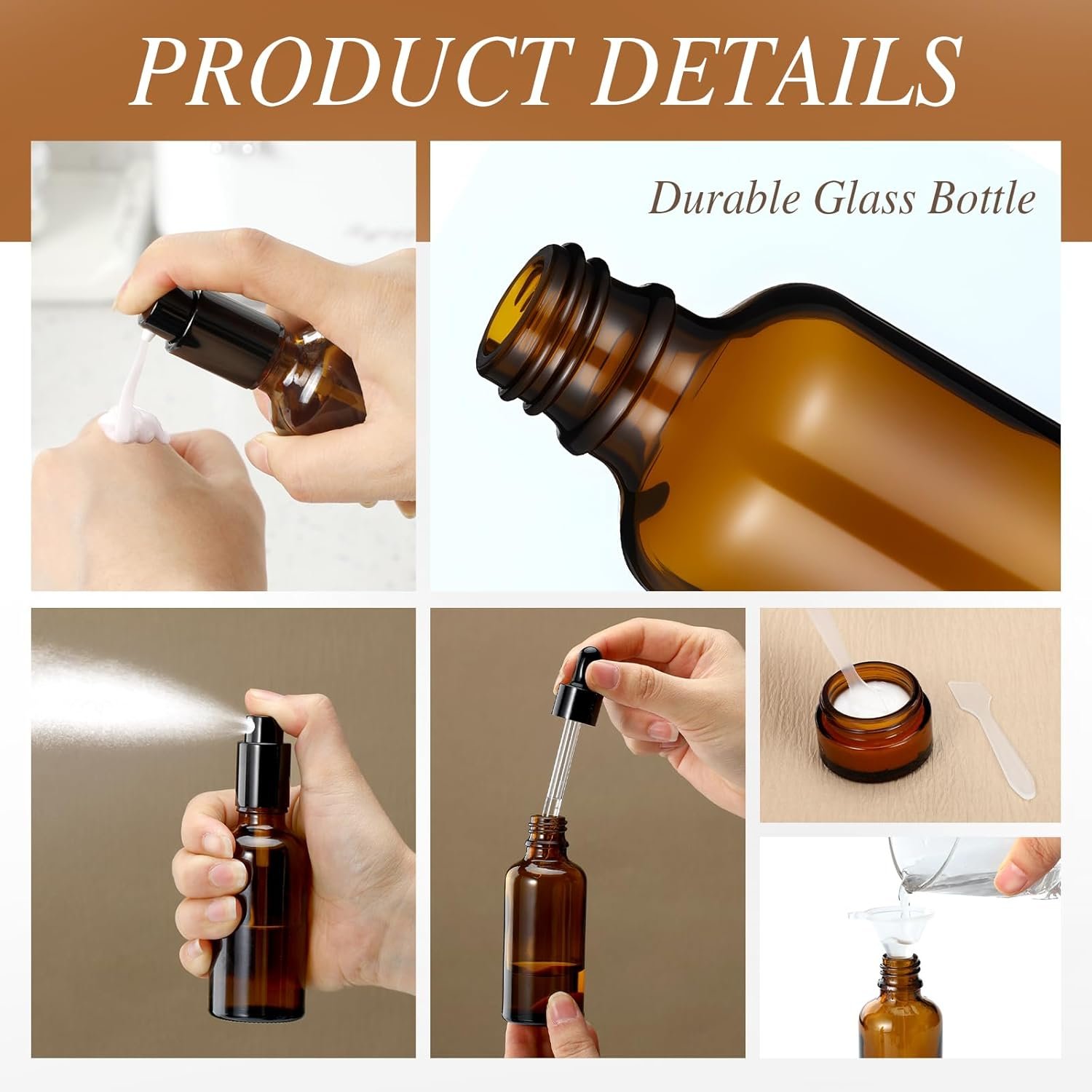 Glass Material: made of durable glass, safe, odorless, refillable and reusable, easy to clean, brown glass bottles can effectively block light and extend the shelf life and stability of the product