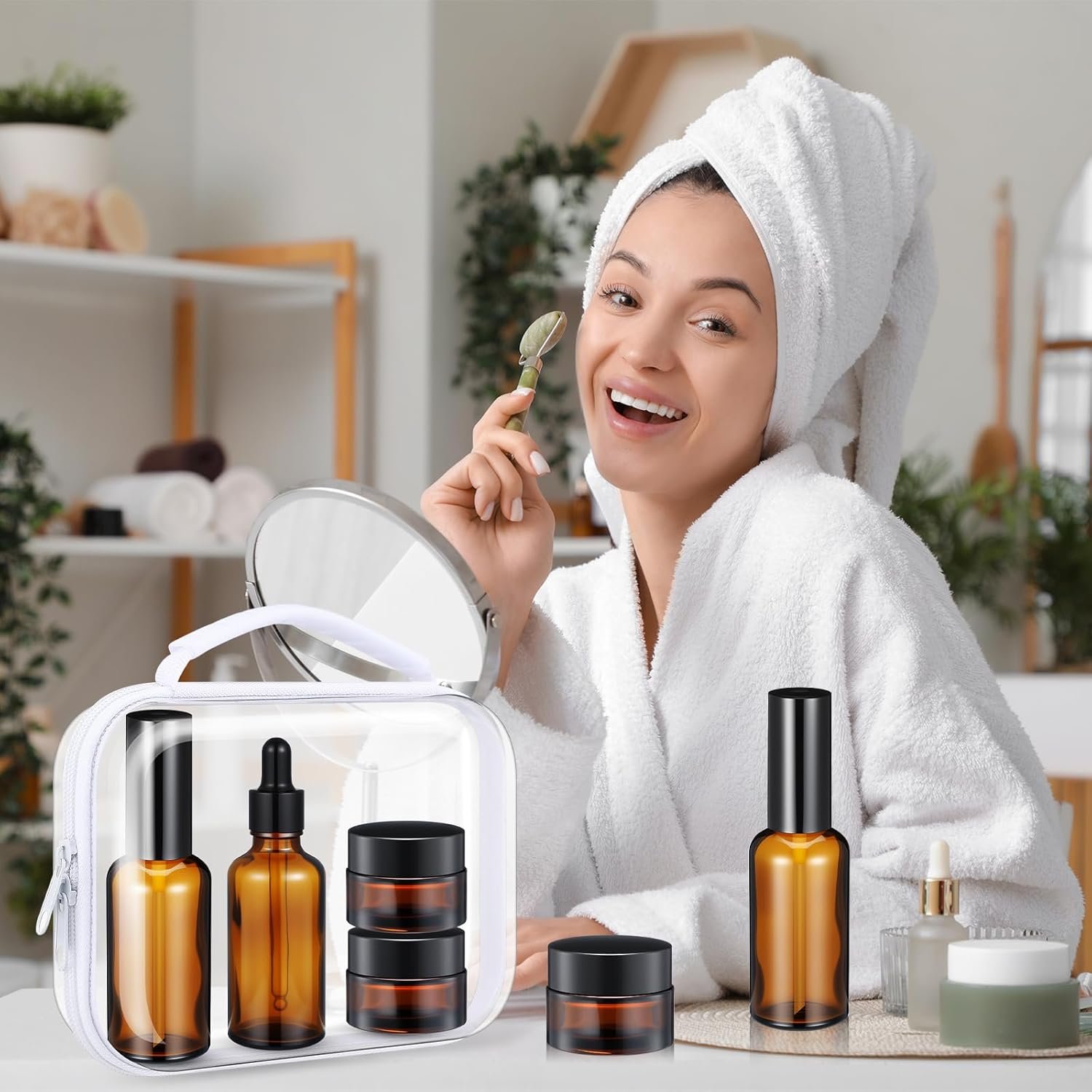 Package Includes: 1 transparent hard shell zipper storage box, 1 50Ml spray bottle, 1 50ml lotion bottle, 1 50ml glass dropper bottle, 3 pcs 15g cream jars, 2 mini funnels and 2 scrapers; Small travel containers of suitable size