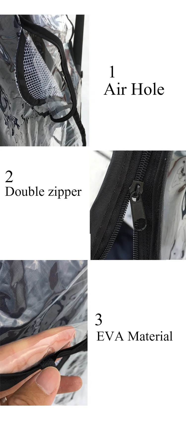 2. Safe EVA material — Our rain cover is made of EVA material. EVA material is safe, non-toxic, and tasteless.