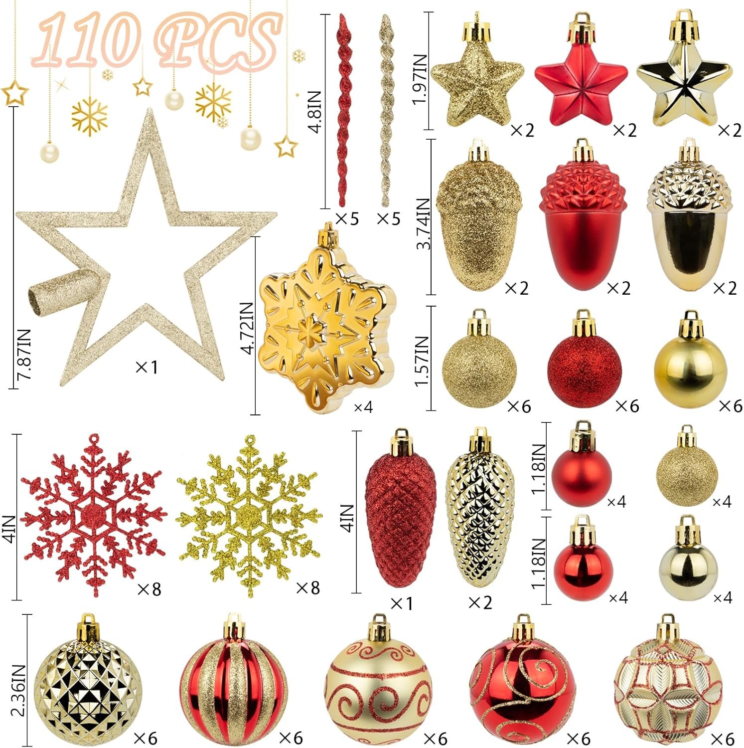 【ASSORTED CHRISTMAS ORNAMENTS】 These red and gold christmas ornaments set have different design, including 30 christmas balls (2.36”), 4 snowflake pendants (4.72”), 6 hanging stars (1.97”), 3 pine cones (4”), 6 nuts (3.74”), 18 christmas balls (1.57”), 16 christmas balls (1.18”), 1 christmas star (7.87”), 16 snowflakes, and 10 icicles
