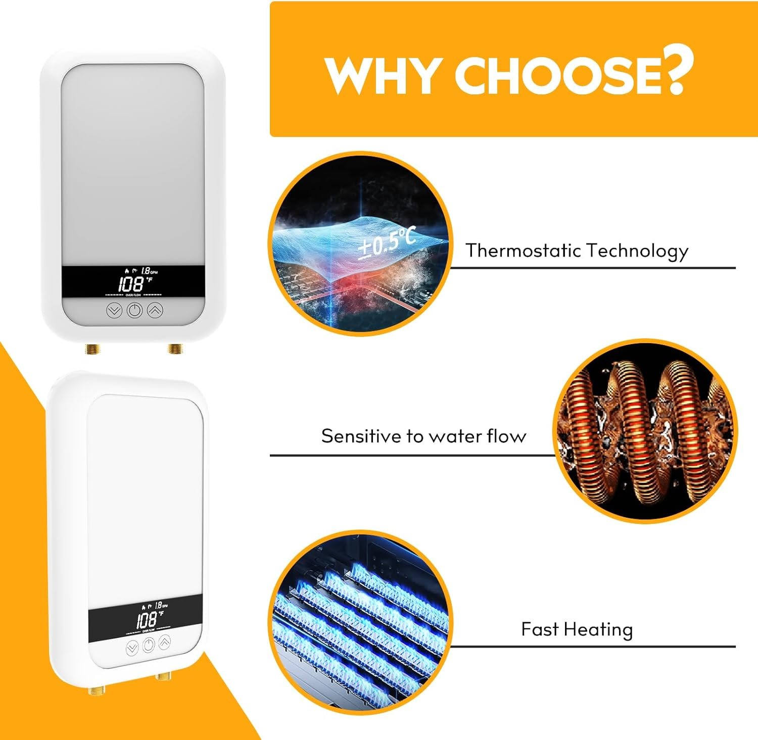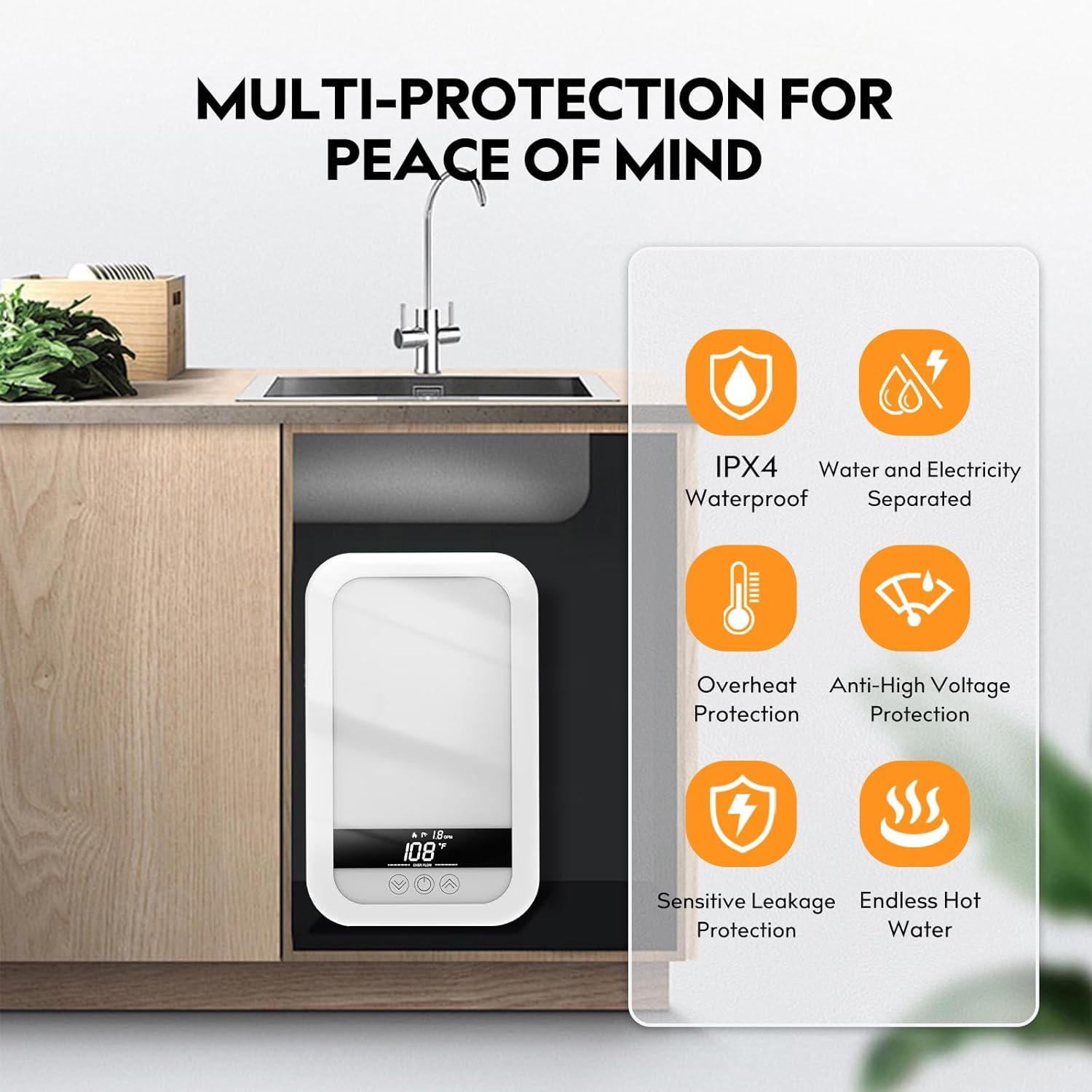 Safe and Reliable: The instant hot water heater has a memory function or an automatic alarm function when the power supply position and failure occur. IPX4 waterproof, leakage protection, dry-burning protection, automatic power-off in over-temperature and inactive states.Leakage protection,when leakage ,the protection device will cut off the power supply immediately