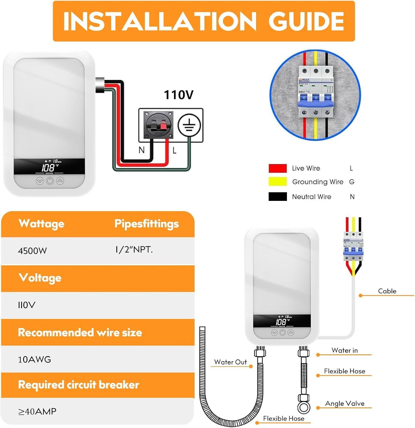 Space Saving: This water heater has a compact appearance, it can be easily installed under the sink, it is very suitable for every corner of your home, no need to occupy an area, enjoy hot water at any time. Make sure it’s the right size for you: 4.5KW at 110V, product measures 9″ x 2.5″ x 5″