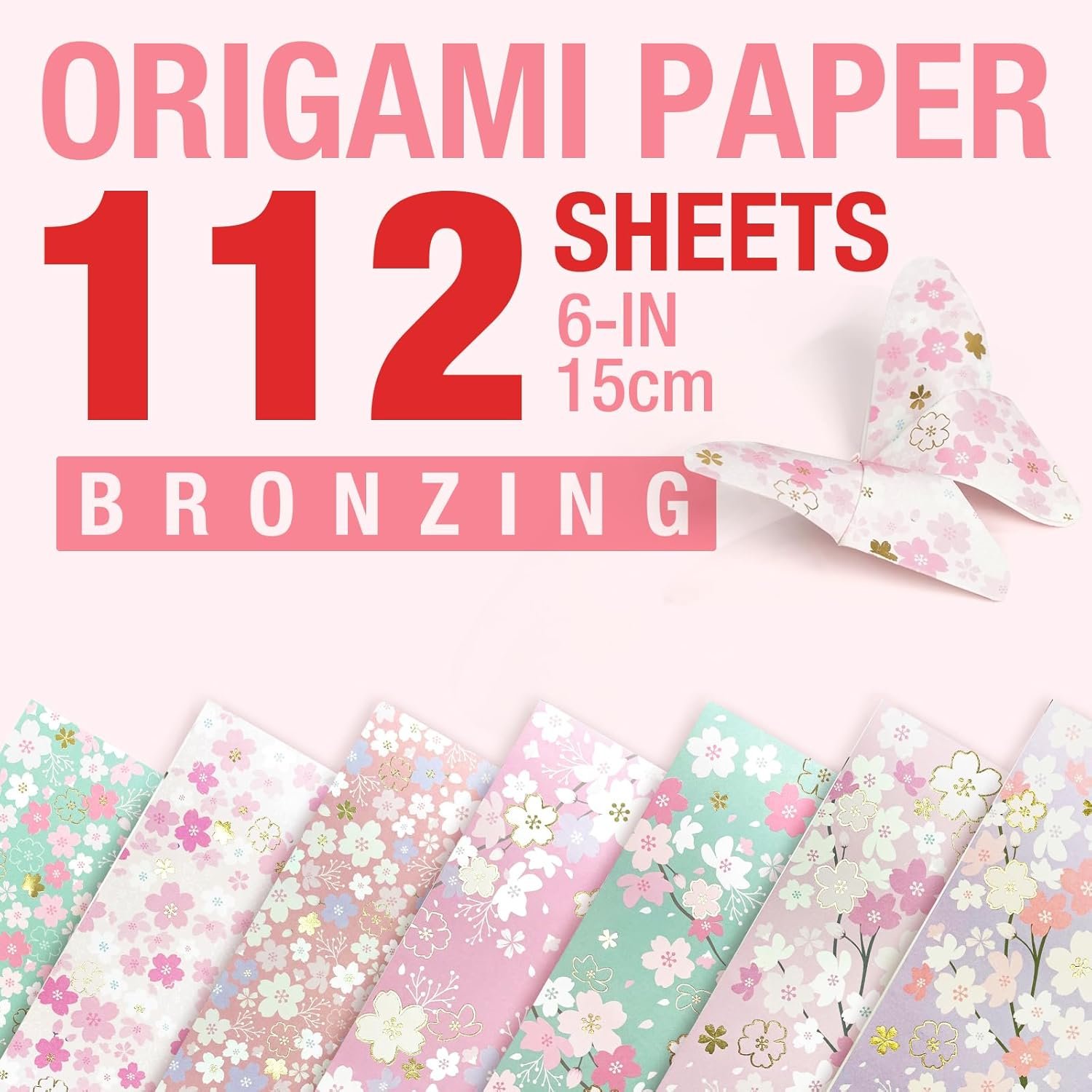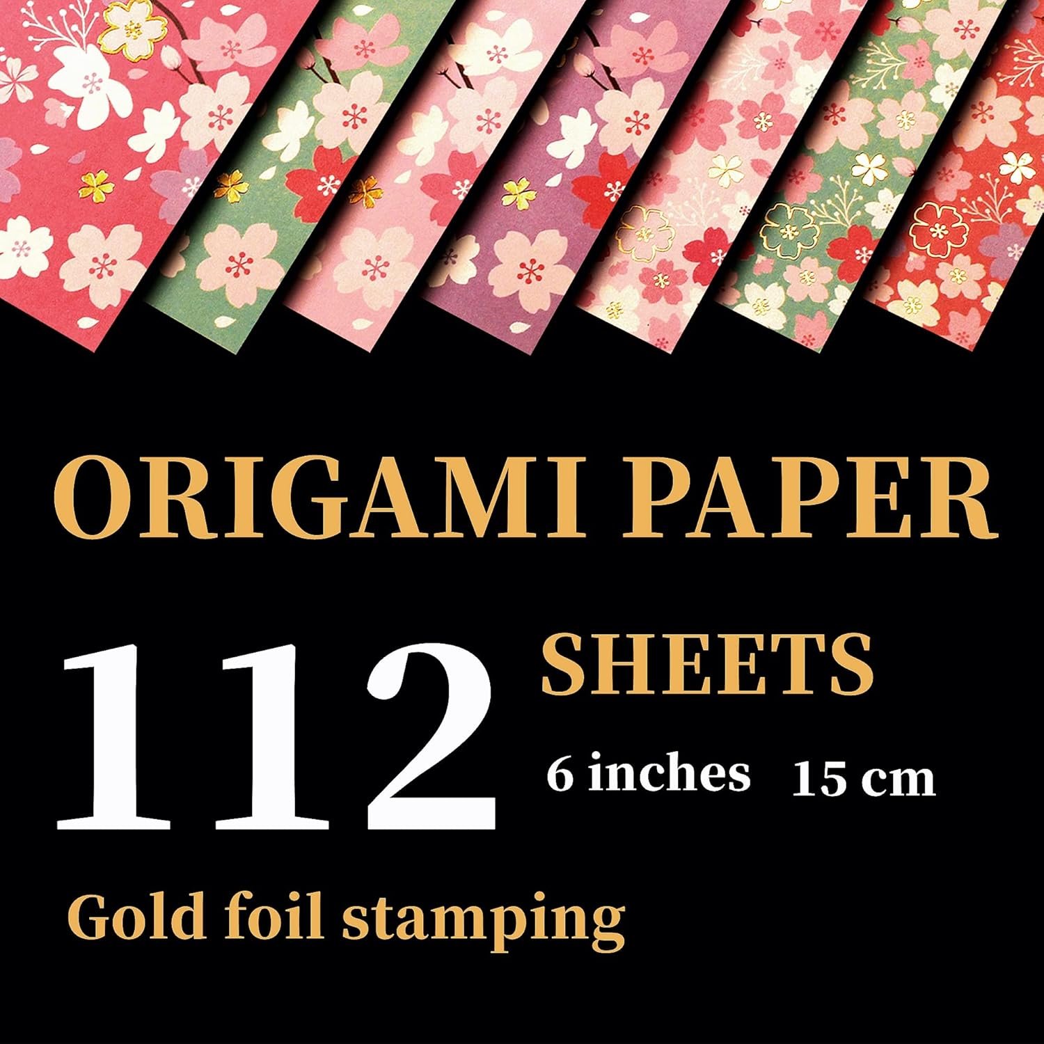 112 Sheets Heavier Origami Paper Japanese Cherry Blossom Pattern Sakura Bronzing Chiyogami 6″ 15cm Washi Easy Fold Paper for Beginner