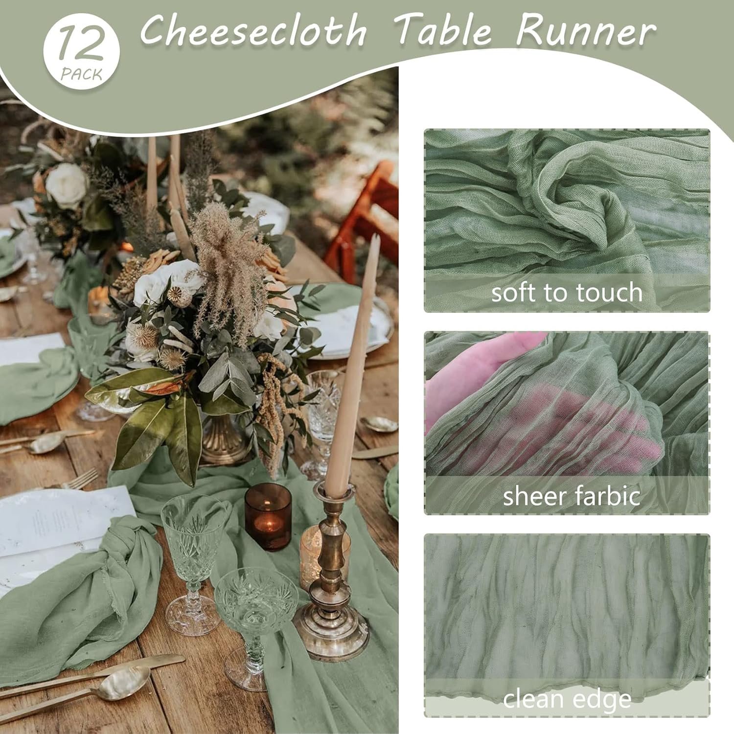 Package Include: you will get 12 pieces 10ft length dusty sage green cheesecloth table runner, enough quantity is suitable for wedding banquets and various parties, the size of each table runner is approximately 35 x 120 inches / 90 x 300 cm, which is large enough to cover rectangle and round tables, can also be spliced together for long tables. Even can be used for chair cover sashes or decorative napkins, backdrop draping or even gift wrapping.