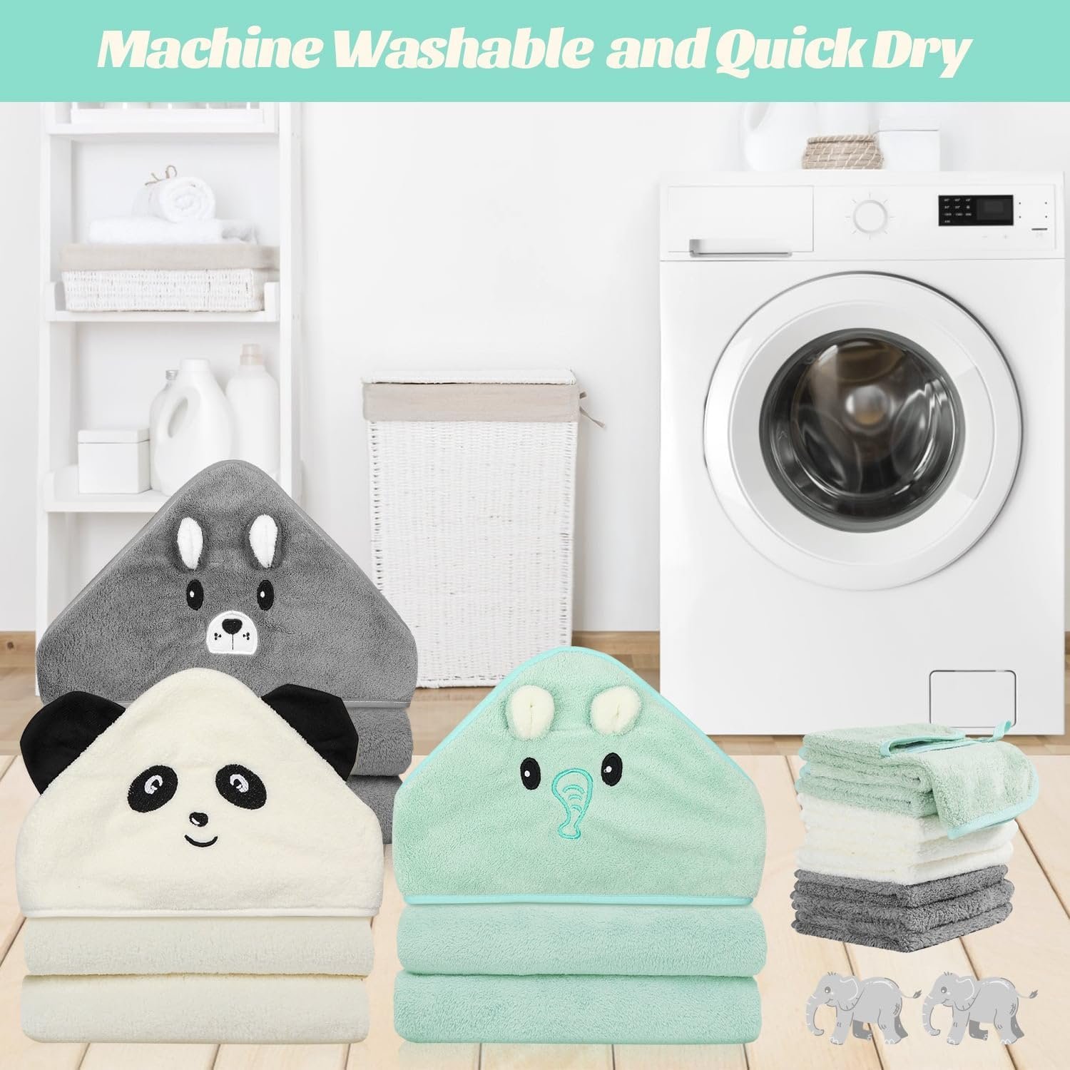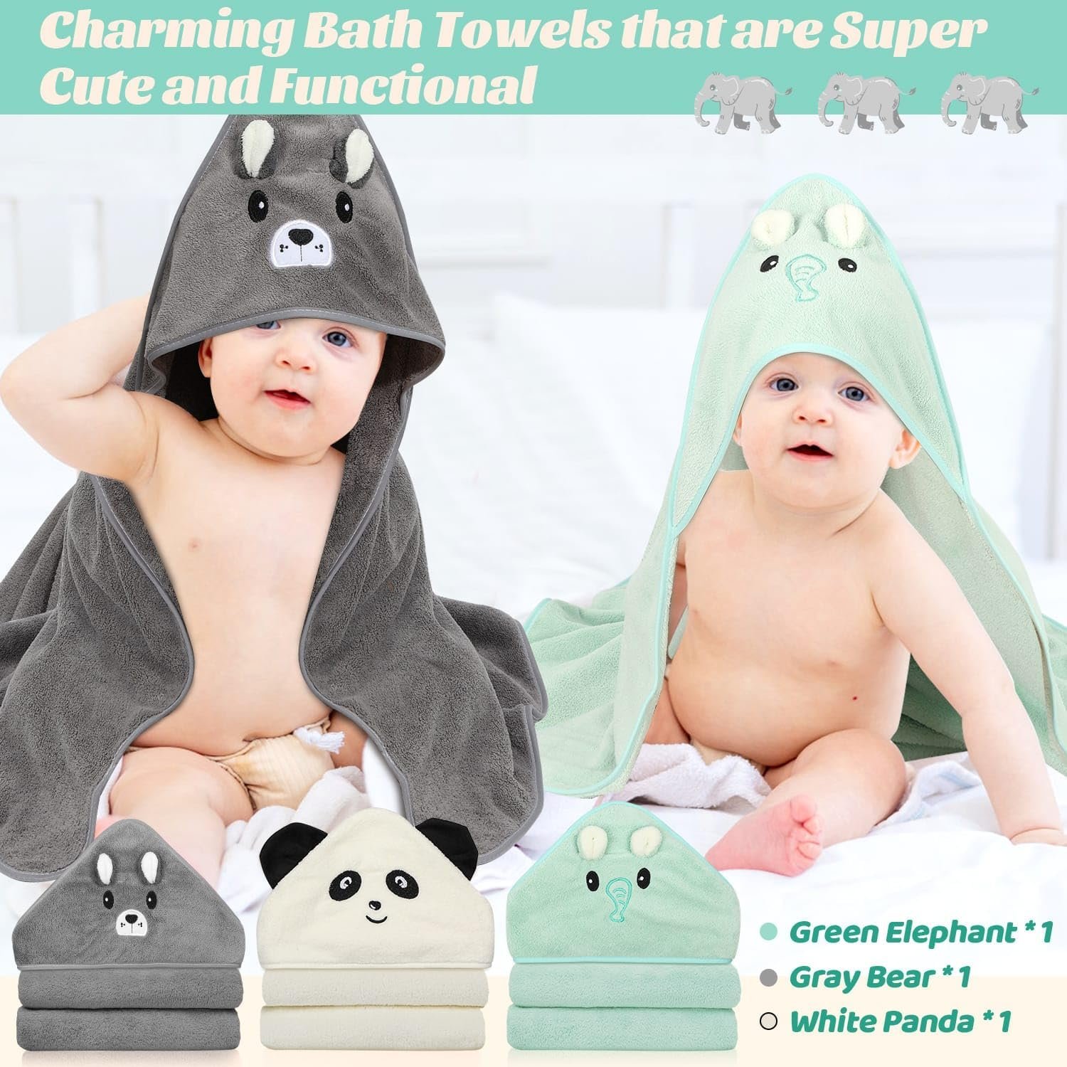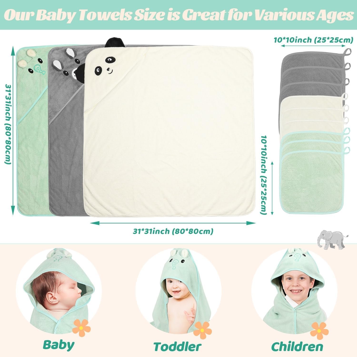 [Cute Design-Baby’s Bath Time Buddy] Our newborn baby towels include three adorable baby towels with hood featuring playful characters: a green elephant, a gray bear, and a white panda. These playful characters make bath time fun and cozy, while the hood keeps your little one warm and dry. Your little angel is sure to love these charming baby towels and washcloths set