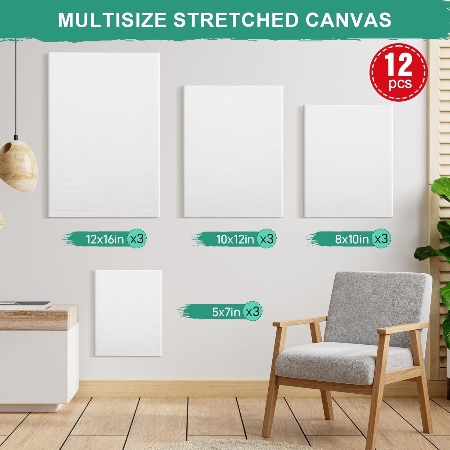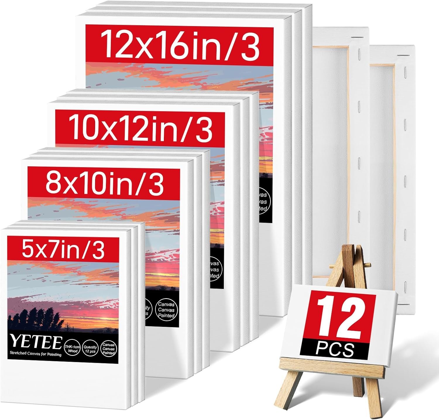 🎨Painting Canvas Pack: 12 Blank canvases for painting in 4 sizes, namely 12×16, 10×12, 8×10, and 5×7 inches mini canvases, with 3 pieces of each size. The diversity of canvas sizes in painting can effectively meet the different painting needs of various people.
