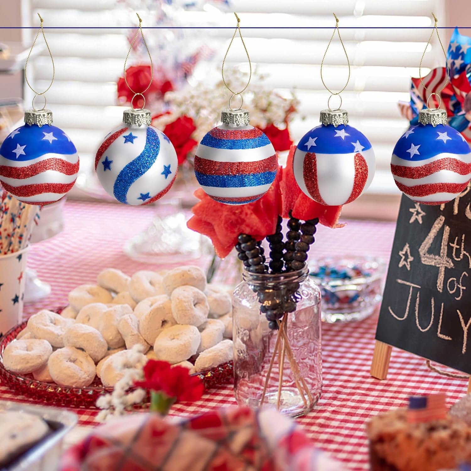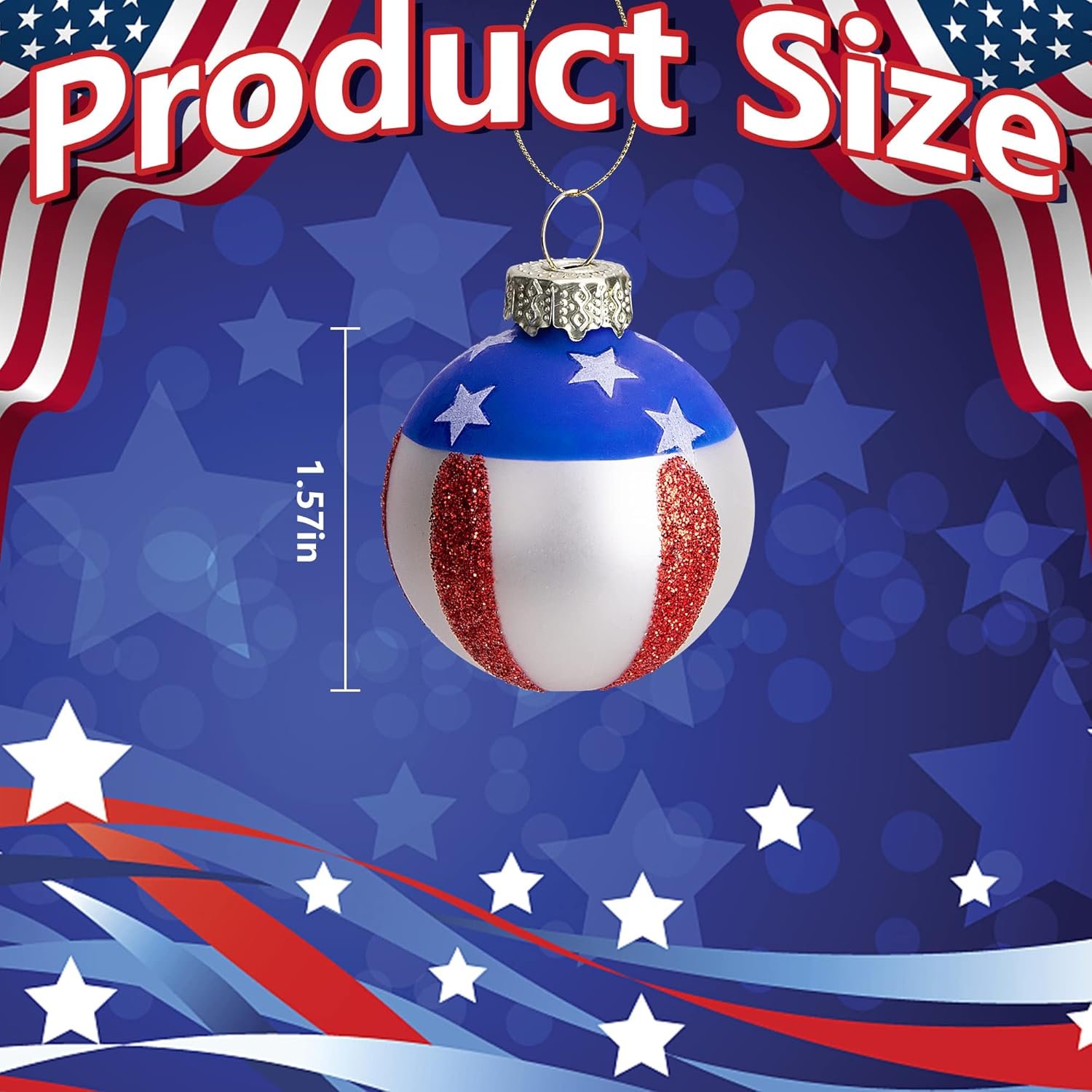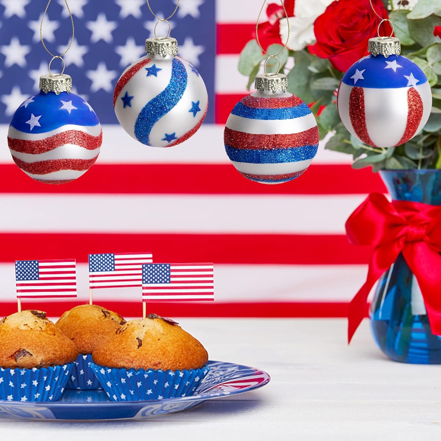 12 Pcs American Flag hanging balls, Baubles are equipped with silver ornament caps, hooks and strings for easy hanging.