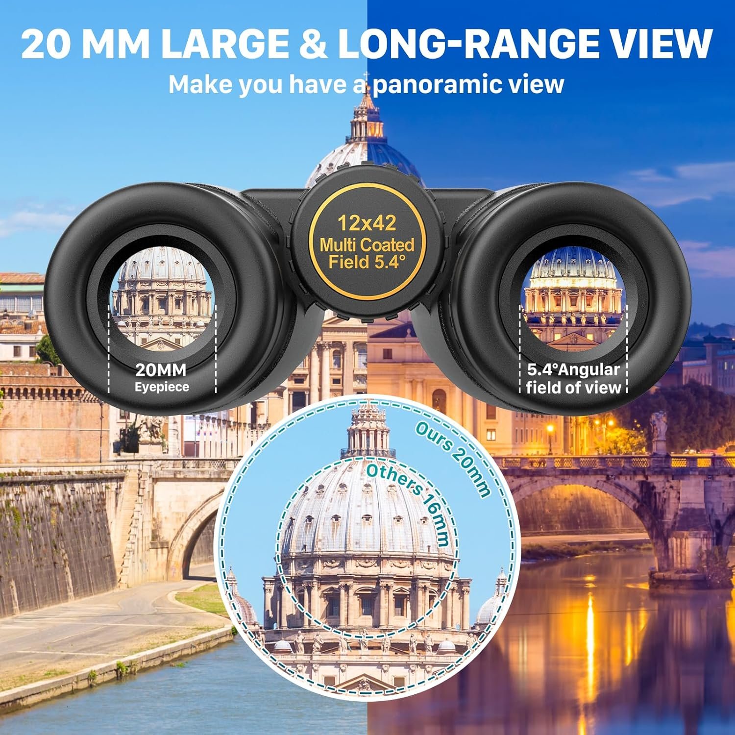 【Professional Powerful Compact 12×42 Binoculars for Adults】With 12x high power magnification and wide-angle 42mm lens delivers best-in-class clarity and brightness; Provided with 21mm green film eyepiece and 330ft/1000yds large field of view, especially designed for outdoor activities such as climbing, hiking, driving, watching wildlife and scenery. This bird binoculars watching also can be used for watching large stage play, vocal concert, a football game, etc