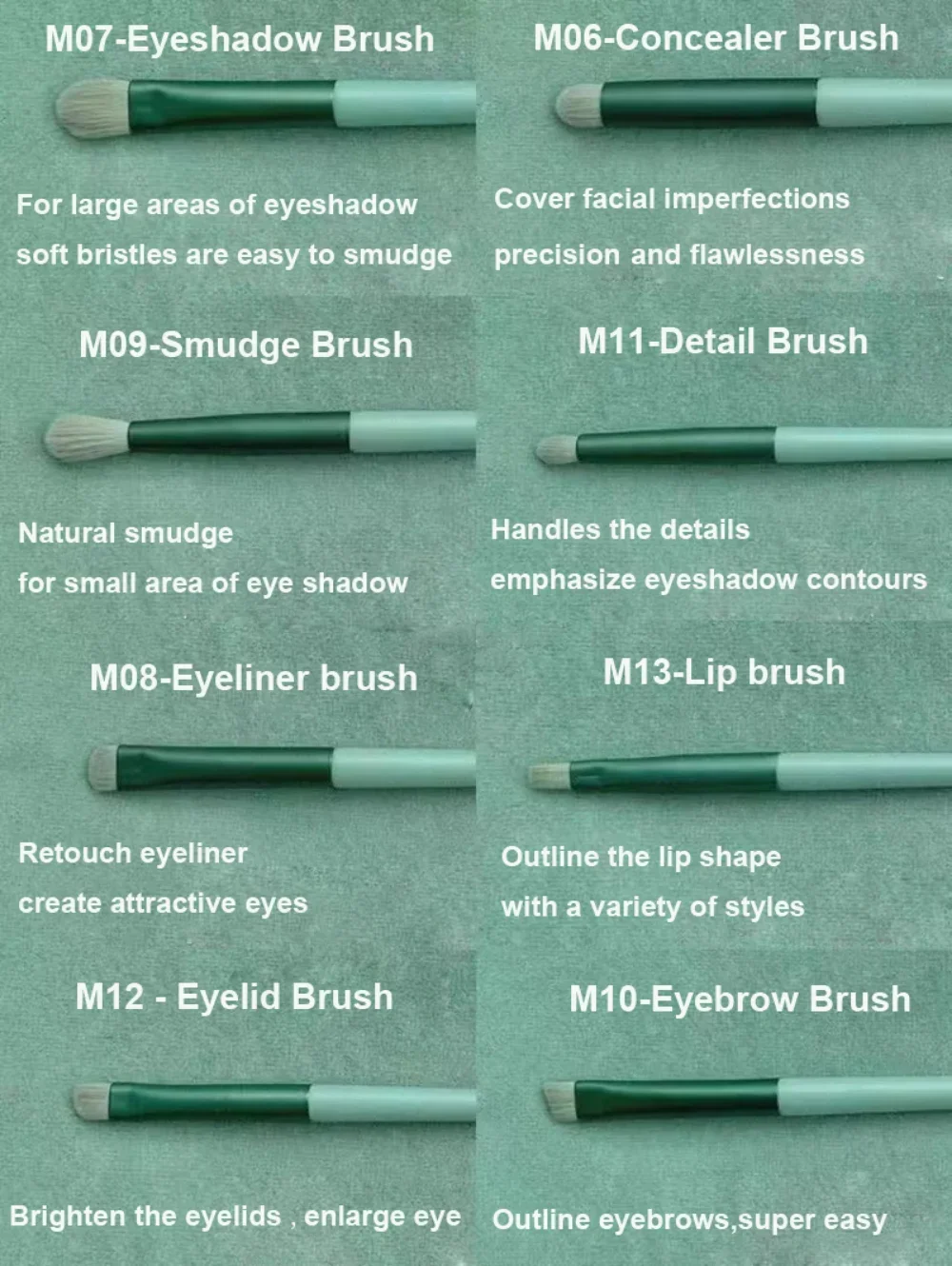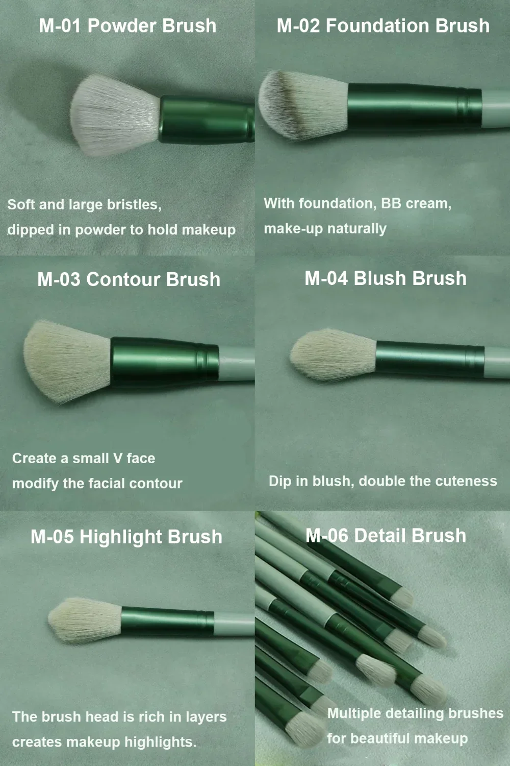 Type: powder brush, foundation brush, shadow brush, blush brush, highlighter brush, detail concealer brush, nose shadow brush, eye shadow brush, eyebrow brush, lip brush.