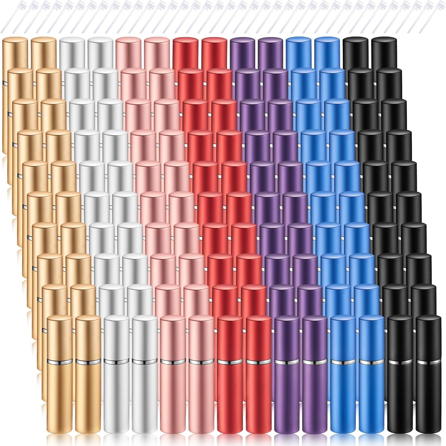 Sufficient Quantity: you will get 140 pieces of mini refillable perfume bottles in 7 colors, namely silver, gold, black, blue, purple, pink and matte red, 20 pieces in each color, with 140 pieces of perfume dispenser pump transfer tools for easy perfume transfer, enough quantities and various colors to meet your daily use and placement needs