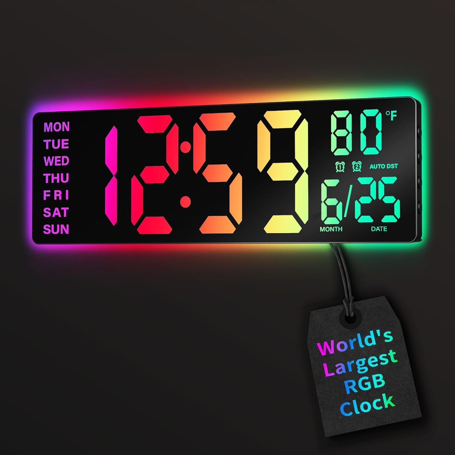 16.5″ Large Digital Wall Clock with Remote Control, RGB Atmosphere Lights with 11 Scenes Mode, Dual Alarms with Big LED Display, Auto DST, Temperature for Living Room Gaming