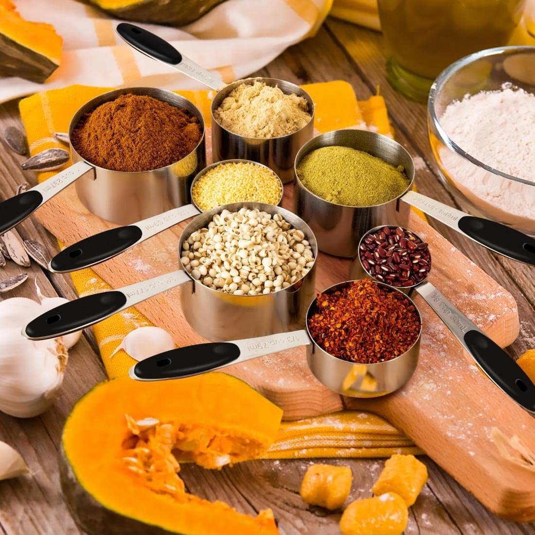 STAINLESS STEEL MEASURING CUPS SET:Including 8 measuring cups (1/16 cup, 1/8 cup, 1/4 cup, 1/3 cup, 1/2 cup, 2/3 cup, 3/4 cup, 1 cup).The handle of each measuring cup is clearly engraved. Stackable – easy to manage.