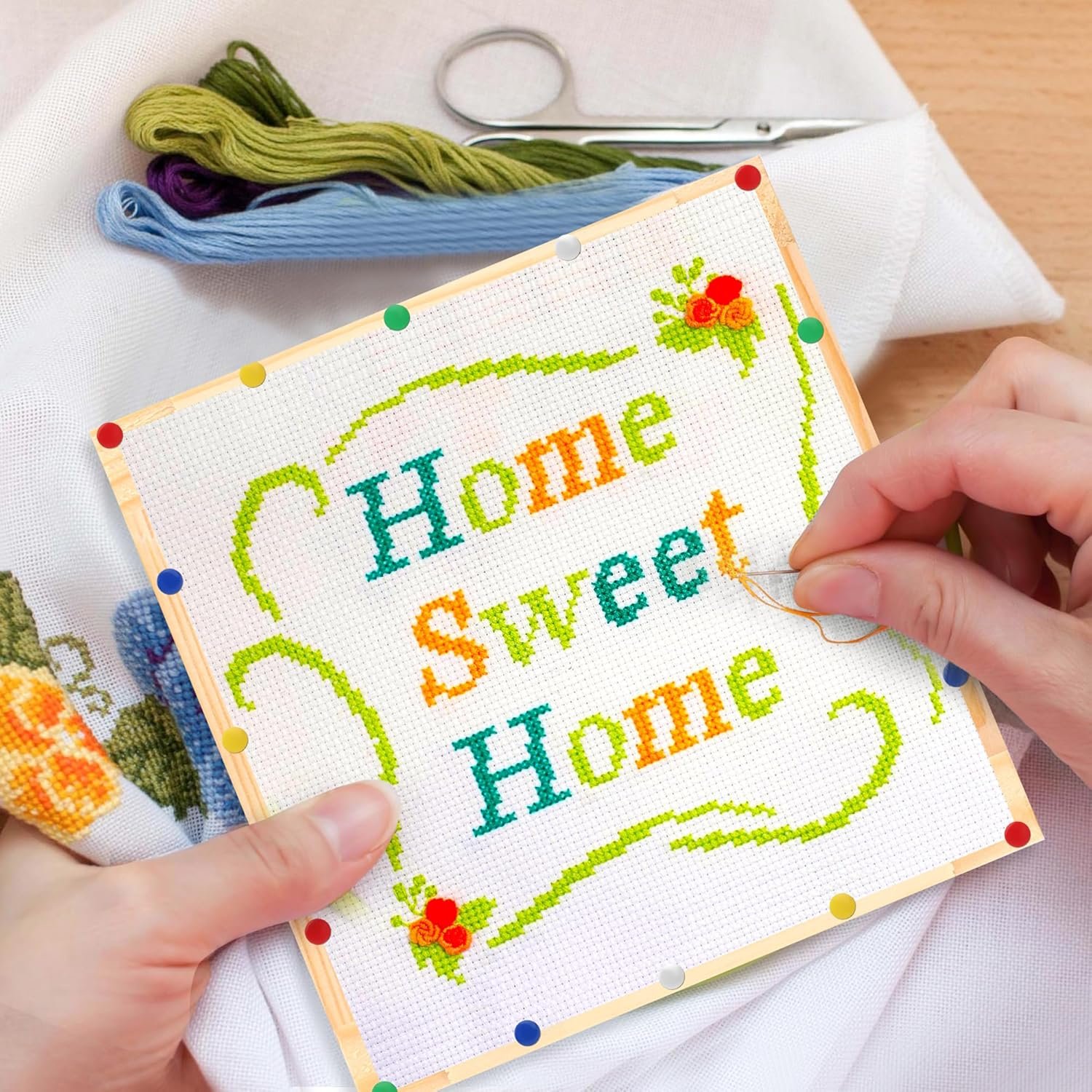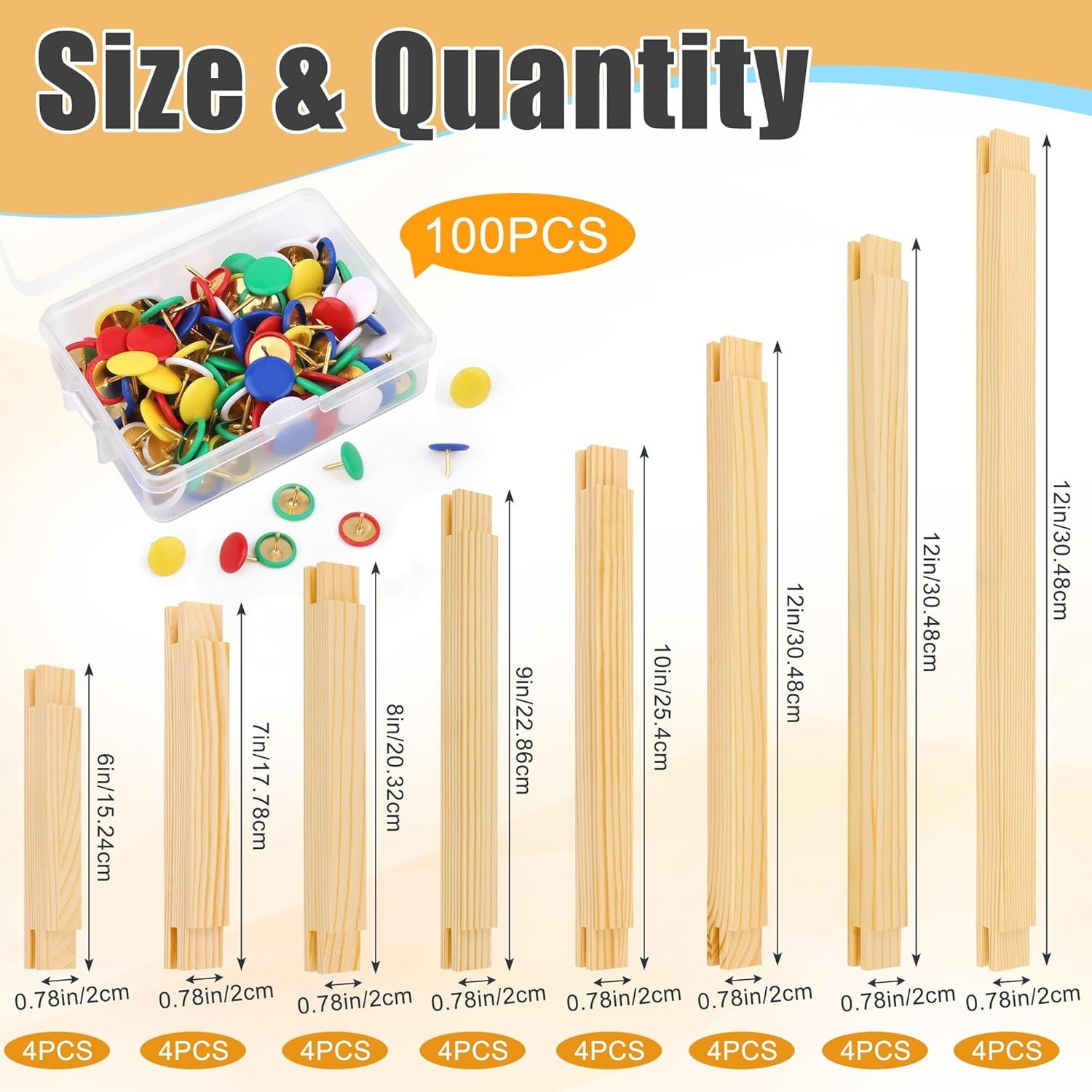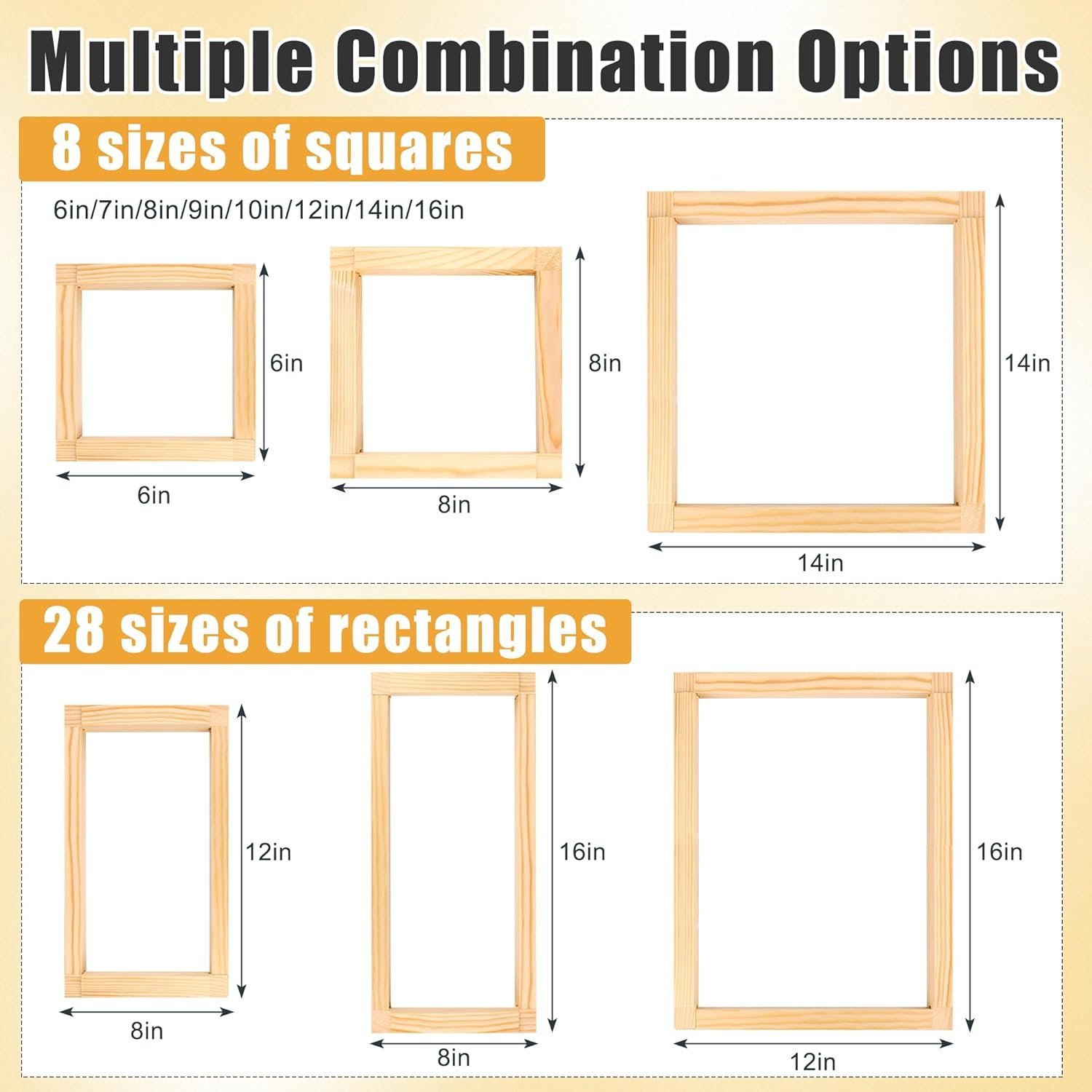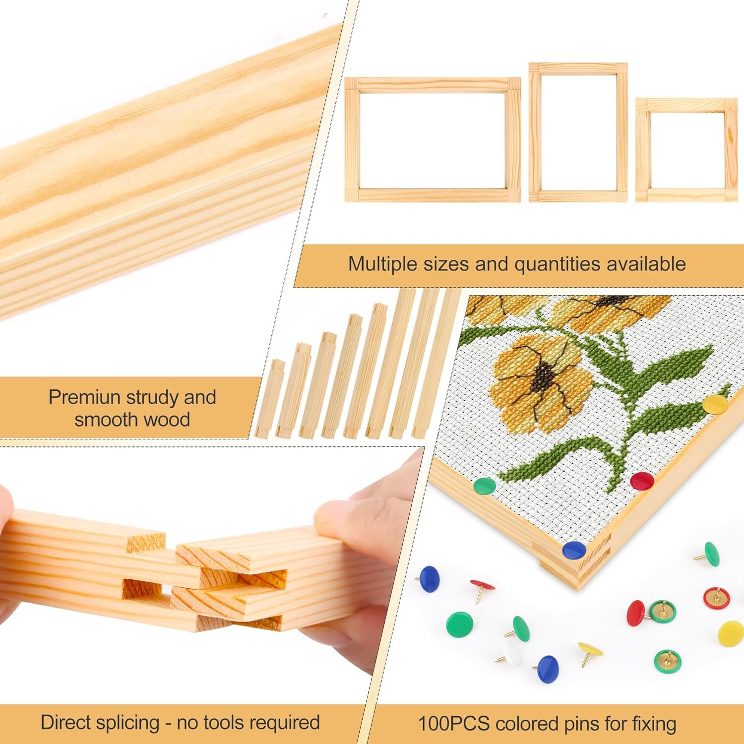 Package Includes: You will receive 16 frames, 32 pcs stretcher bars, 8 different sizes (6 inches/7 inches/8 inches/9 inches/10 inches/12 inches/14 inches/16 inches), 4 bars of each size, and 100 colorful pins, can meet your different needlework size needs.