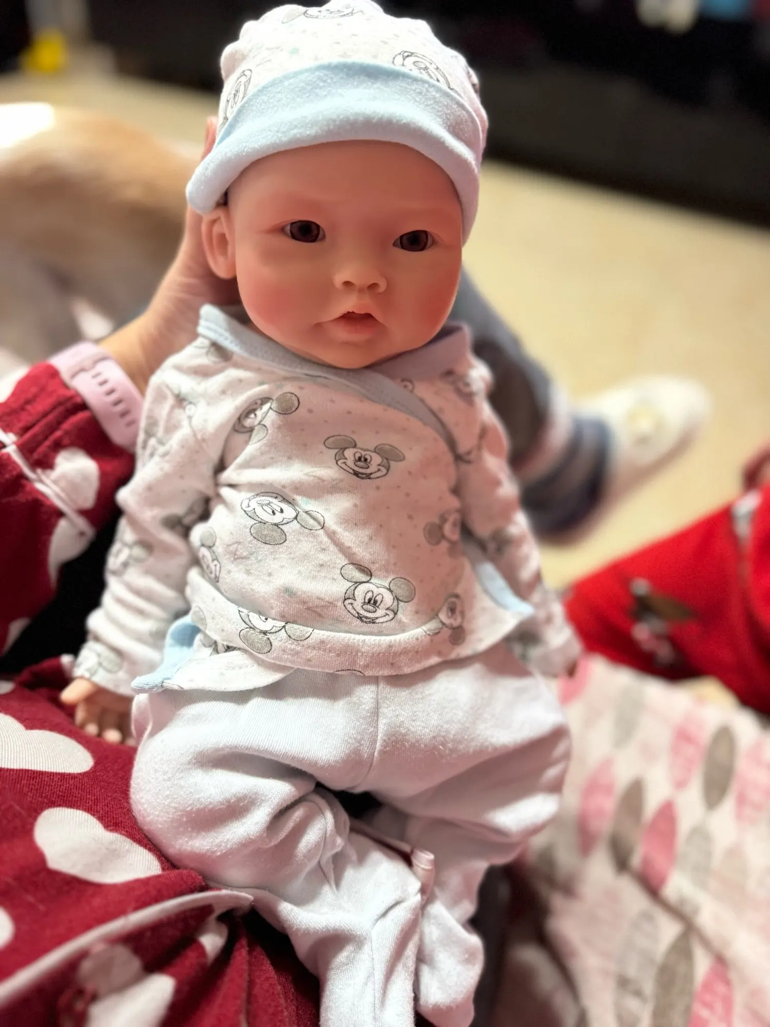 Very nice, all made of silicone, perfect size and hair, and a very cute face… it’s a boy. Comes in a little box with accessories, pacifier, bottle, blanket, and birth certificate.