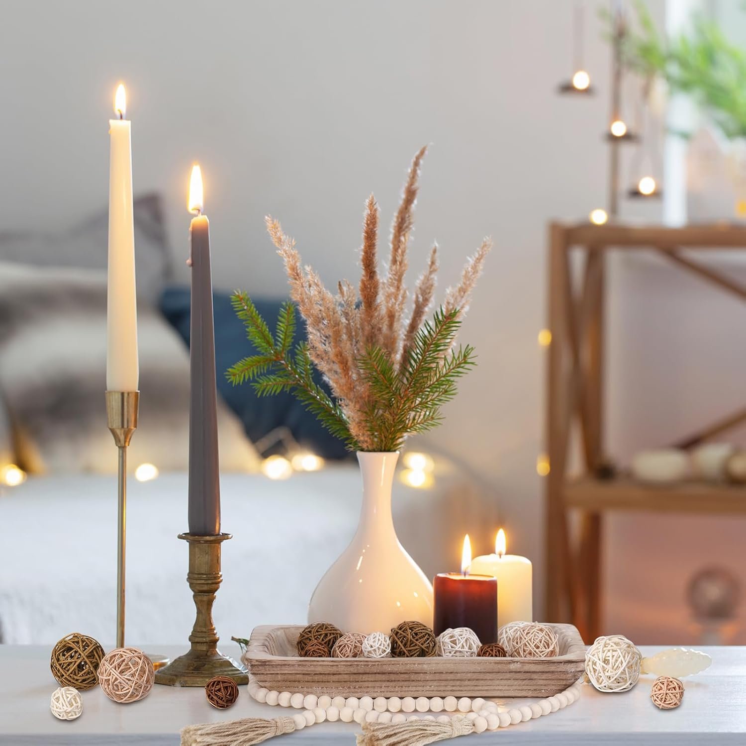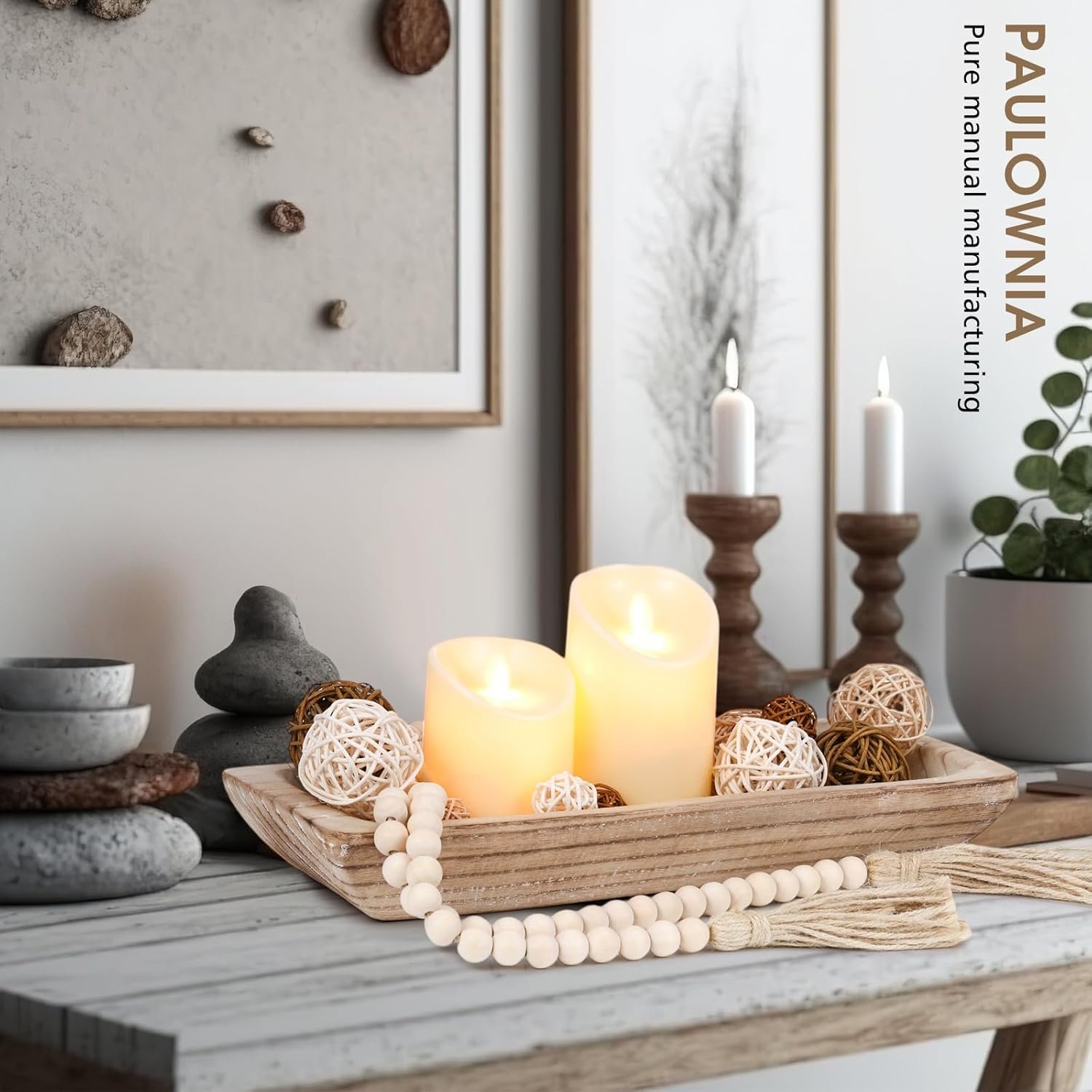 Natural Wood Centerpiece: the decorative wooden tray is handmade from natural paulownia wood, and each wood grain is different that may be slight changes in color and size; The decorative wicker ball is made of rattan weaving, in 3 different colors; The bead string is made of wooden beads and hemp rope; The material is safe, thick and durable, a nice complement to rustic and boho style decoration